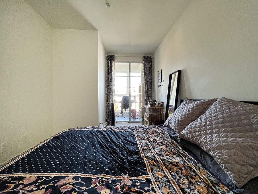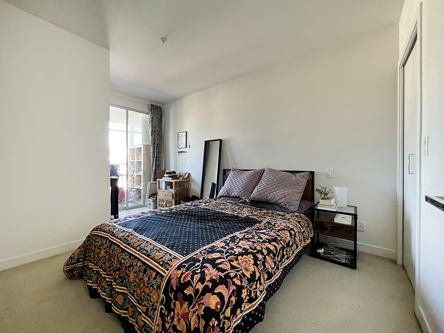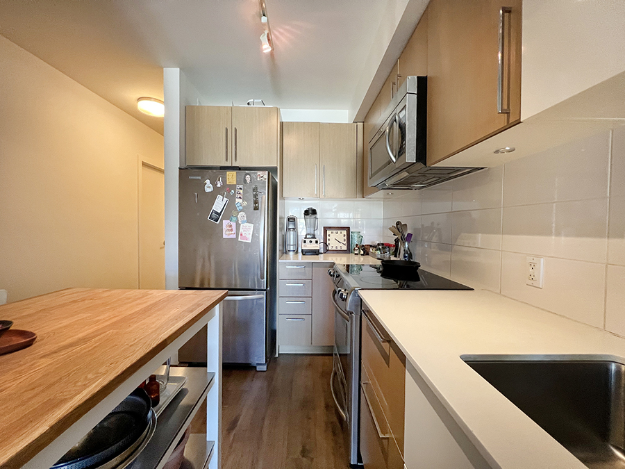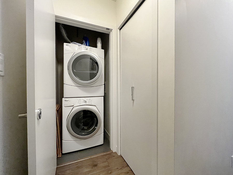 Features Include 1 spacious bedroom with large closet 1 full bathroom, 1 enclosed den, perfect as an office space, 1 large flex space, Large, open living room with floor to ceiling windows, Open plan kitchen with ample storage space, Stainless steel appliance package – fridge, stove/oven, dishwasher, and microwave, In-suite washer and dryer