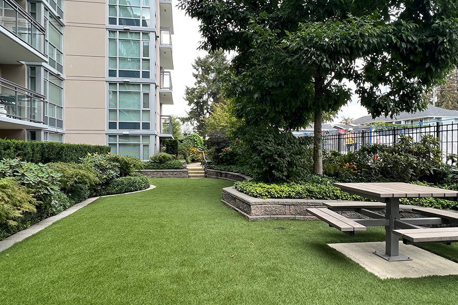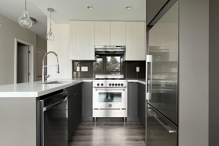 Features include a designer kitchen equipped with Quartz Countertop, high-end appliances that include Full-size Fisher & Paykel fridge, Bertazonni Gas range & Samsung dishwasher, spacious primary bedroom with a walk-in closet, covered balcony, and in-suite washer and dryer.