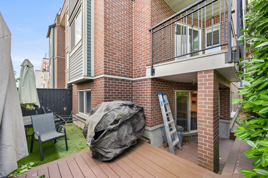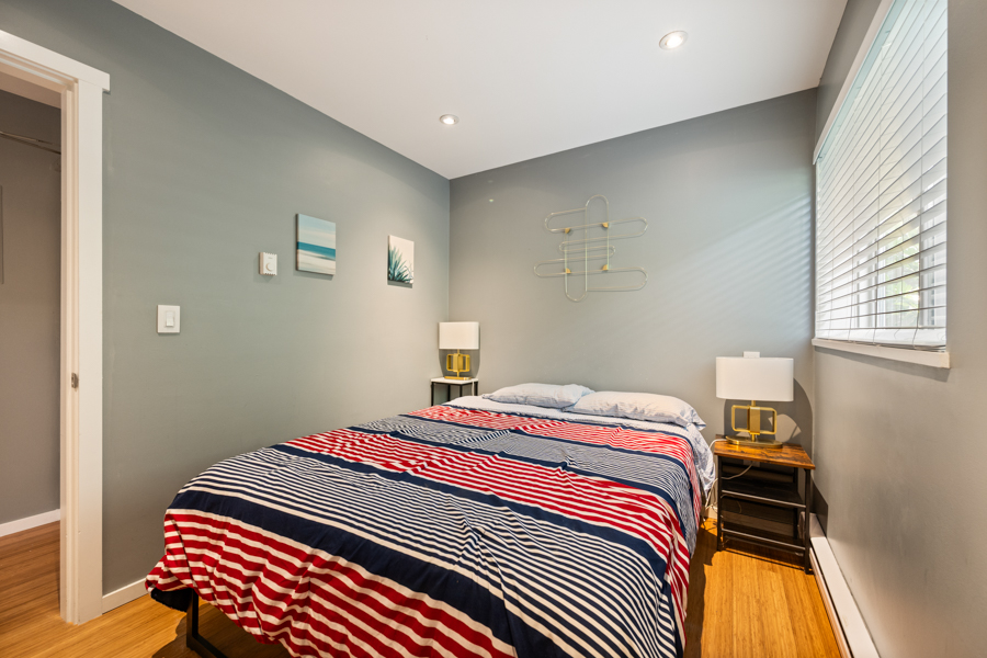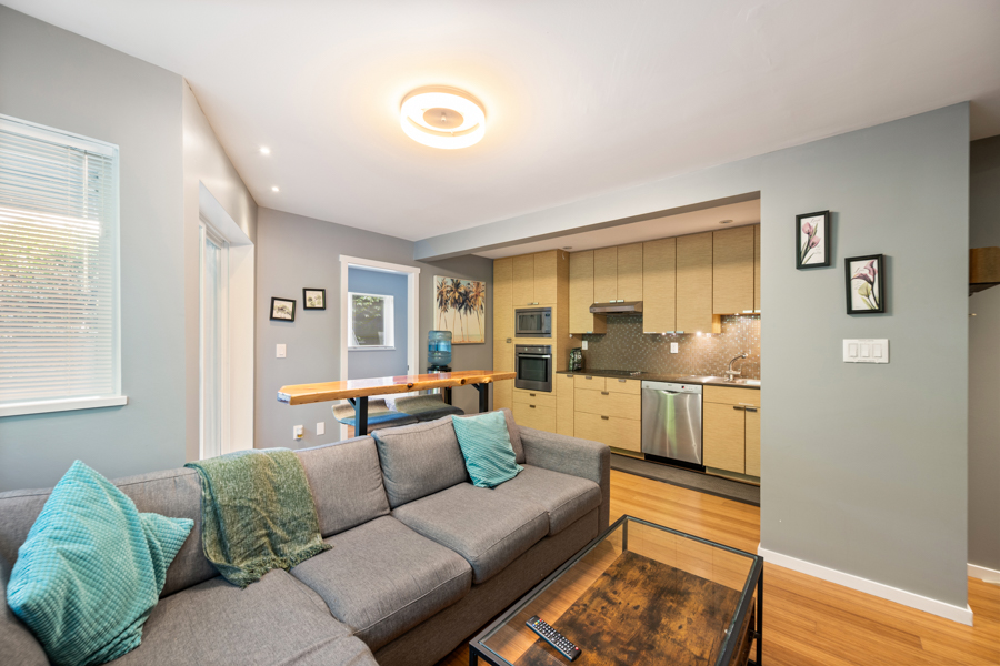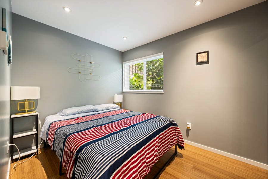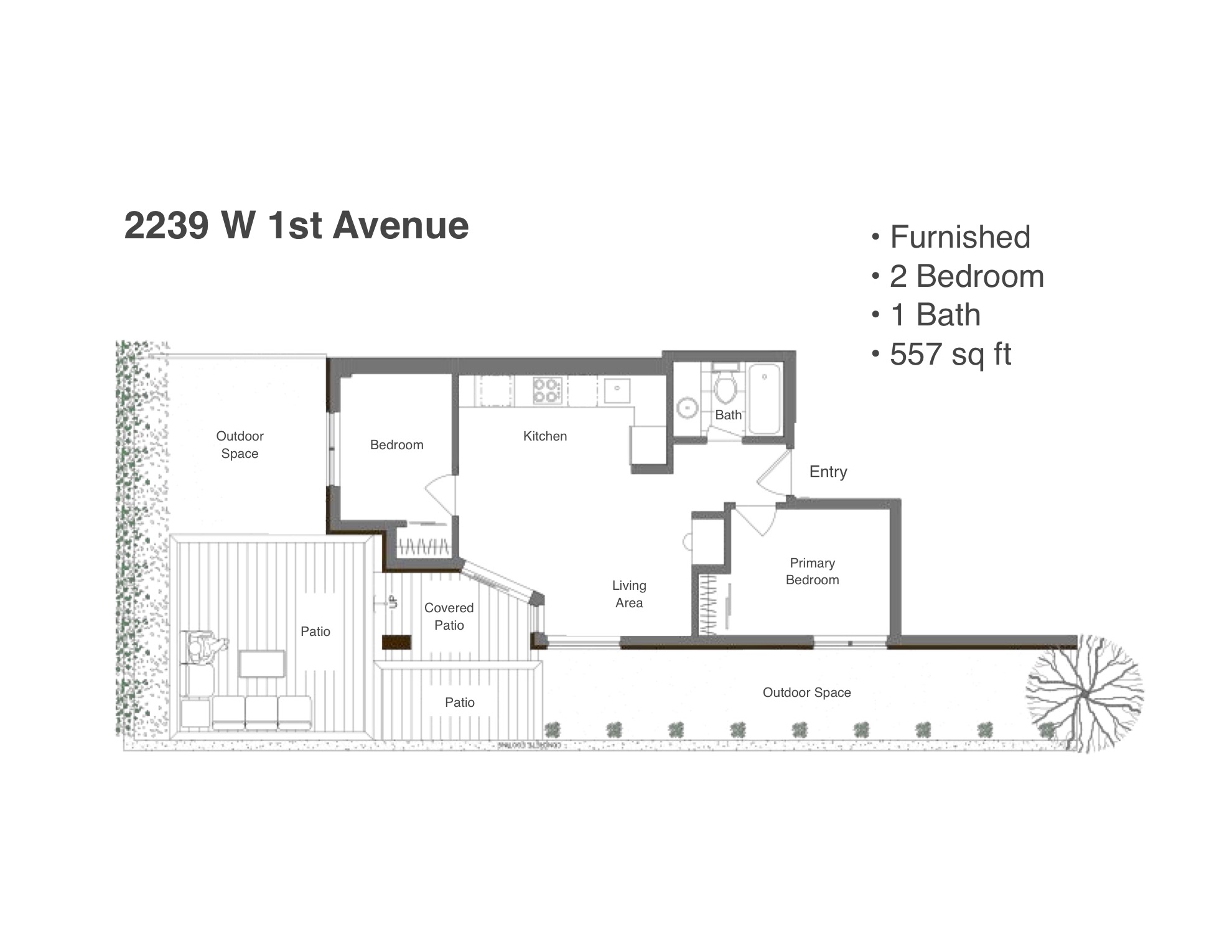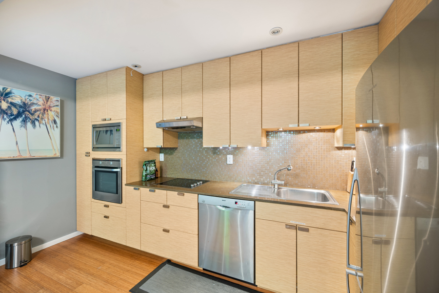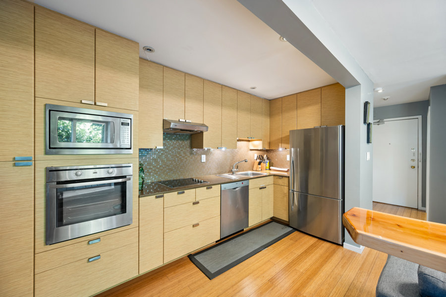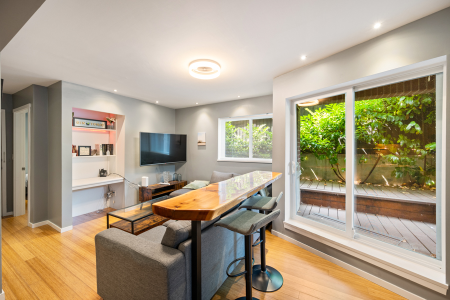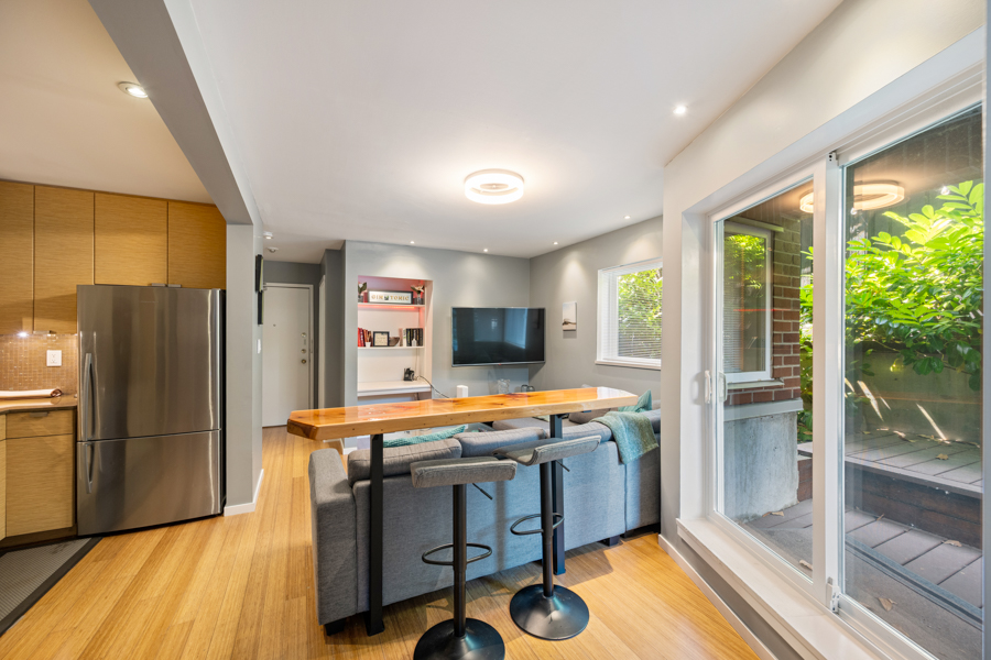 Features in this fully furnished ground floor unit features a large private patio with outdoor space, includes BBQ. An open plan upgraded kitchen with stainless steel and integrated appliances: fridge, stove, oven, dishwasher, and microwave. Spacious primary bedroom, and second bedroom or office. Shared laundry in building.