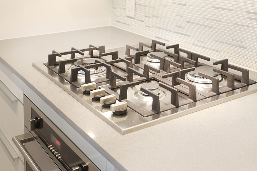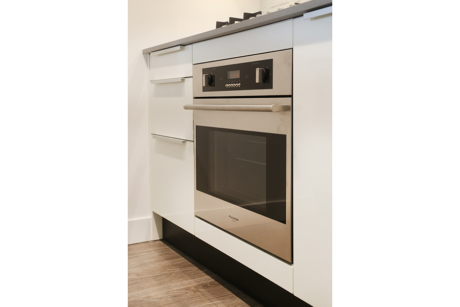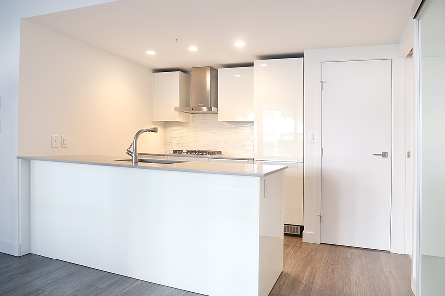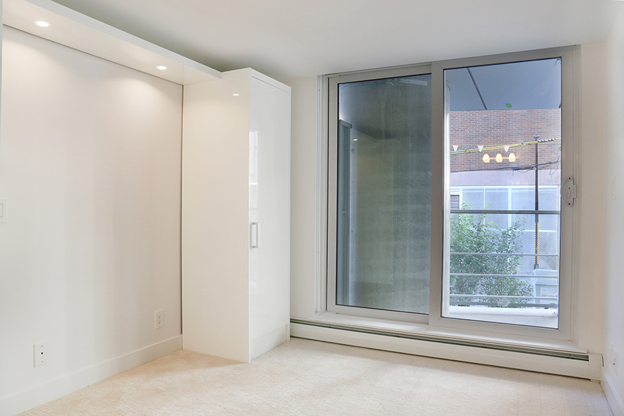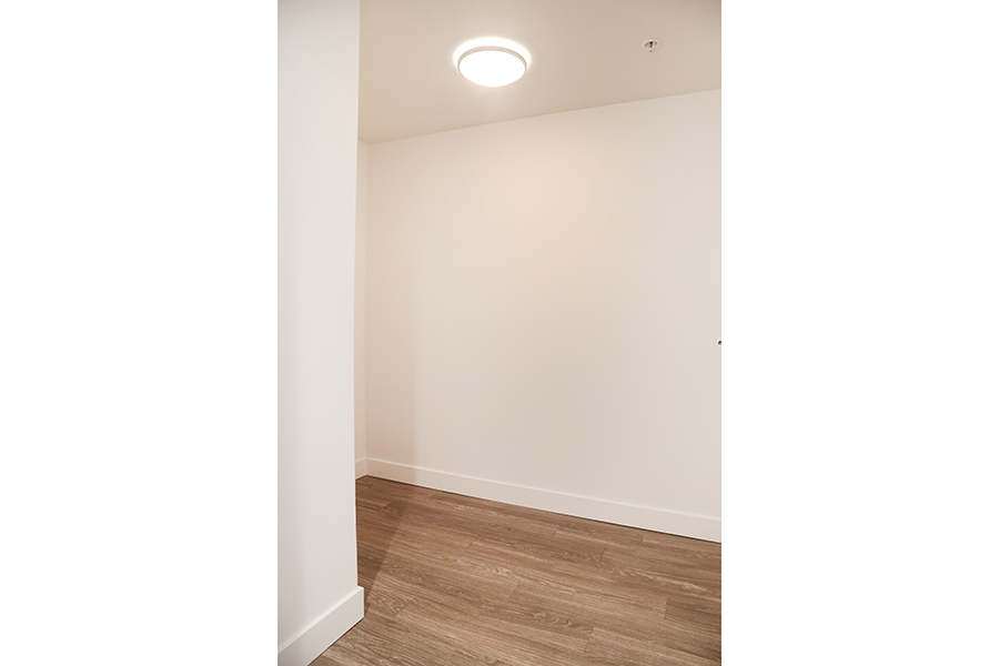 Features in this unit include large windows and roller blinds, ensuite wheelchair accessible bathroom, laminate flooring throughout living areas, plush carpet in bedrooms, open plan kitchen with European cabinetry systems, elegant polished-edge quartz countertops, Stainless steel and integrated appliances: fridge, stove/oven, dishwasher, and microwave, in-suite washer and dryer, large flex space, perfect as an office, storage room, or pantry, large open-air balcony.