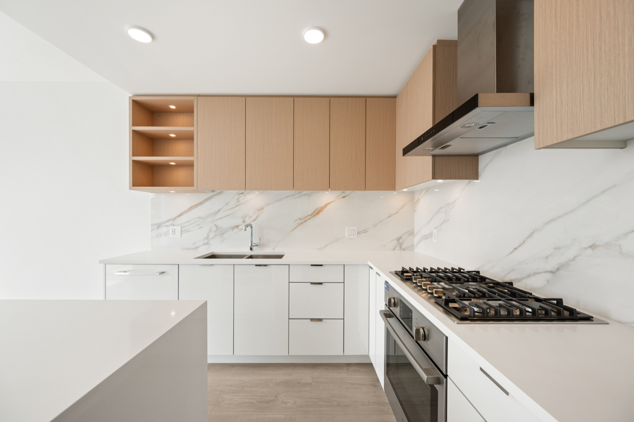 Features in this 10th floor unit include Laminate flooring throughout, Air-conditioning, and Floor to ceiling windows. Modern open-plan kitchen with under-cabinet task lighting, quartz composite countertops, and breakfast bar seating with Full-sized stainless steel and integrated appliances by Bosch & Fisher & Paykel: fridge, gas cook top, oven, dishwasher, and microwave. Walk-through closet in bedroom with direct access to bathroom. Den/Flex space and Spa-Inspired Bathroom with deep soaker tub and LED vanity.
