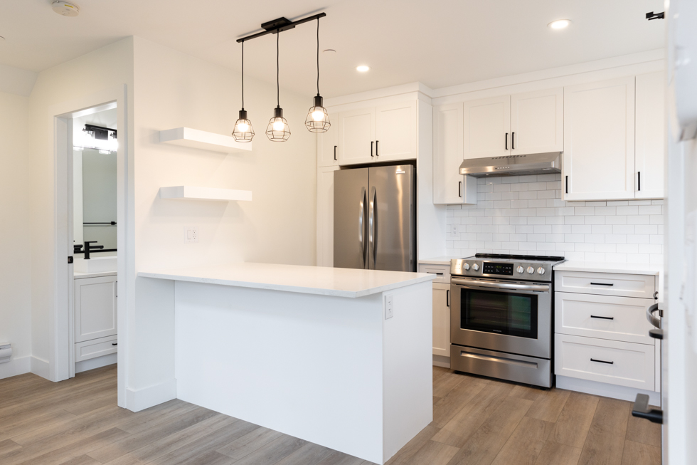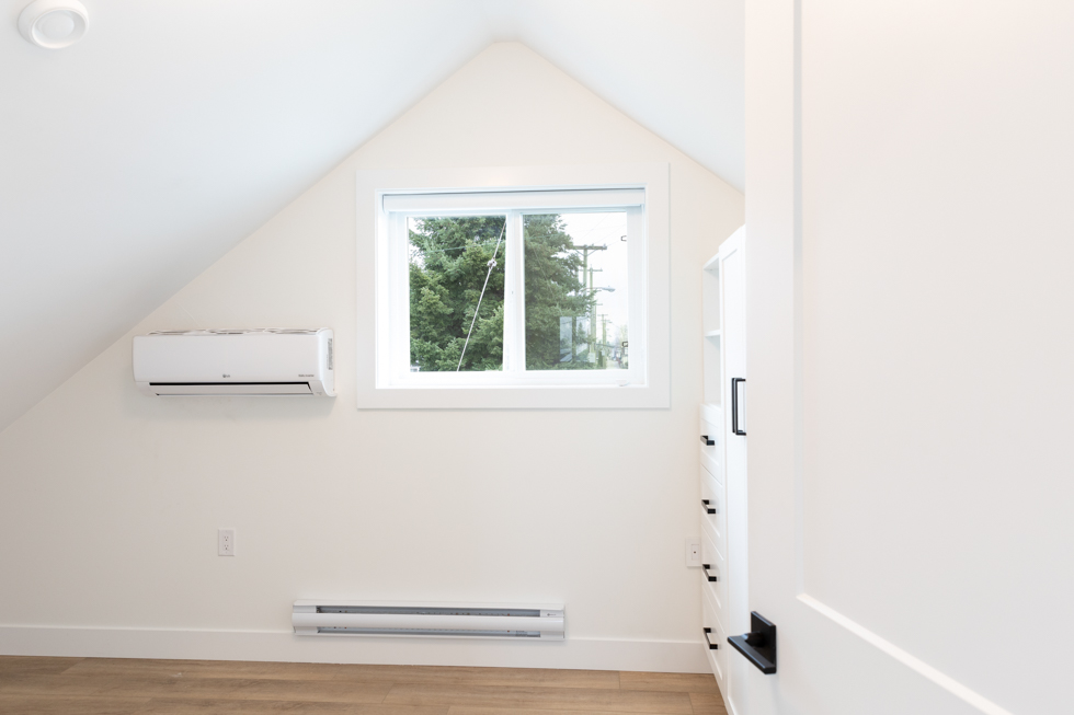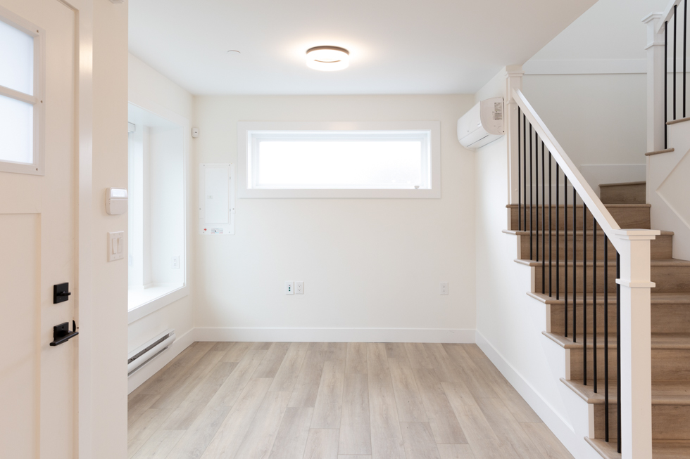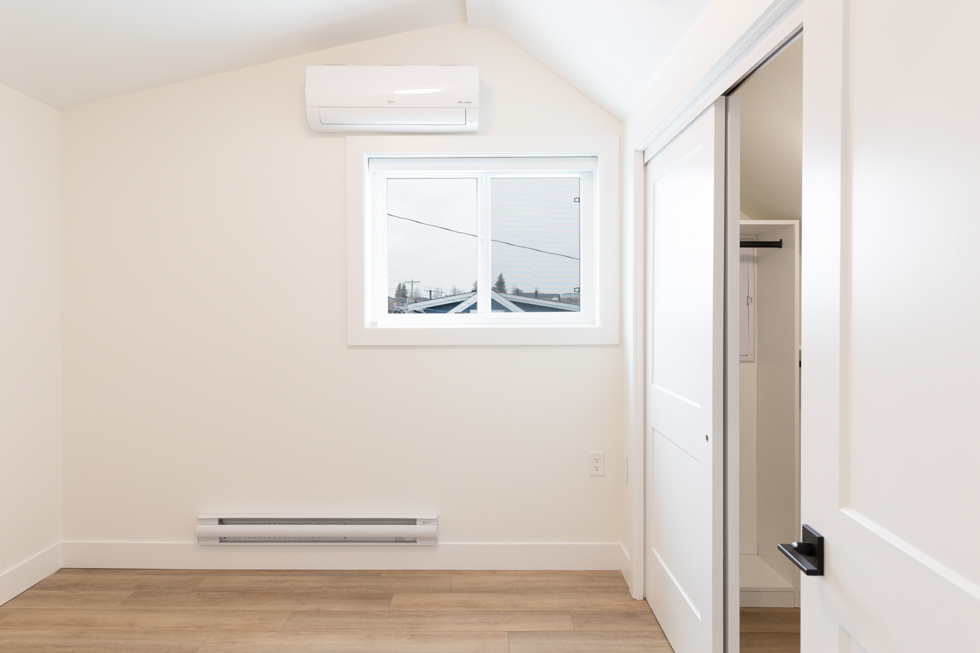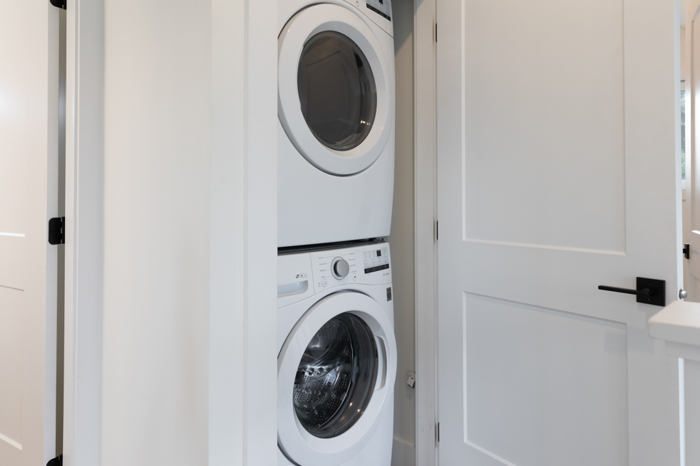 Features in this 2-level laneway home include a modern black & white colour scheme with black finishes throughout, laminate flooring, private entrance via gate, air Conditioning in living area and bedrooms, modern and bright kitchen with breakfast bar and full-size stainless steel appliances: fridge, stove, and dishwasher. A Primary Bedroom with walk-in closet and built-ins, and secondary bedroom with built-ins, as well as in-suite washer and dryer.