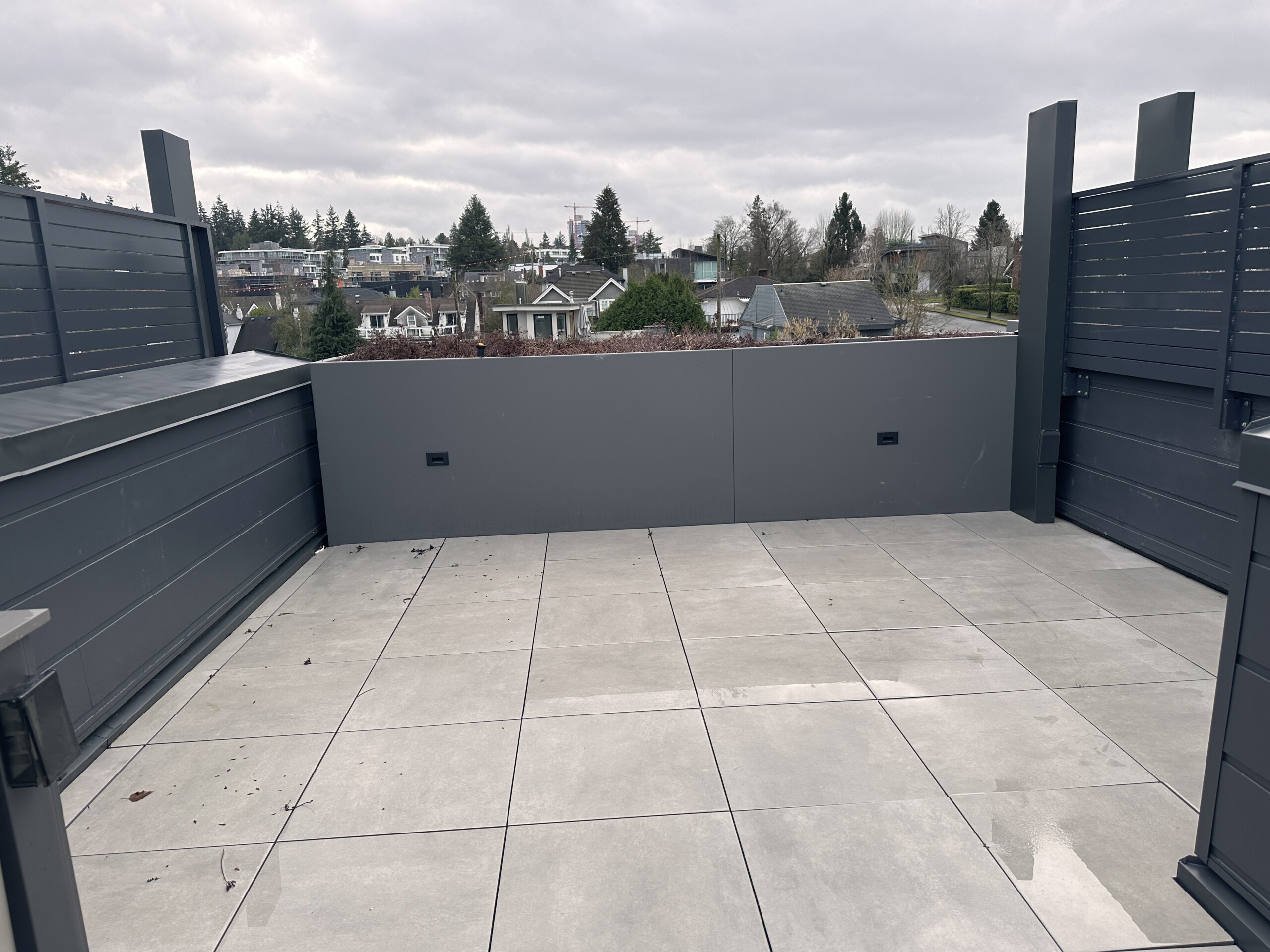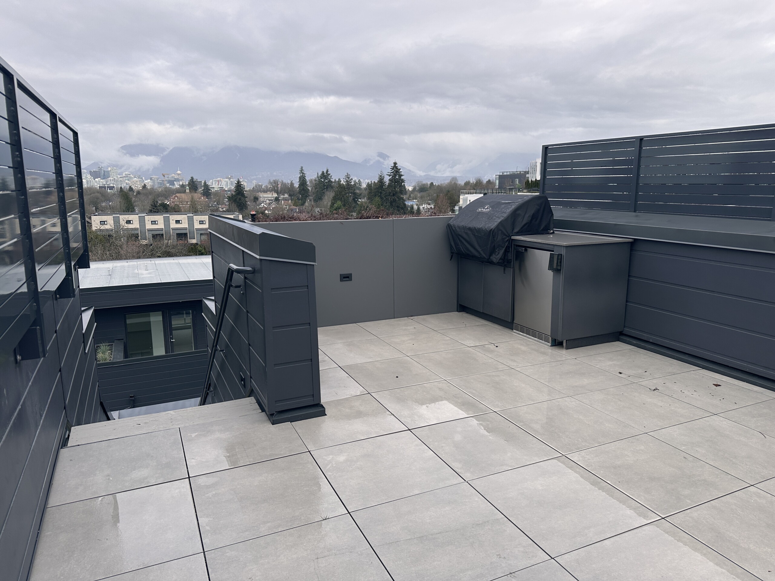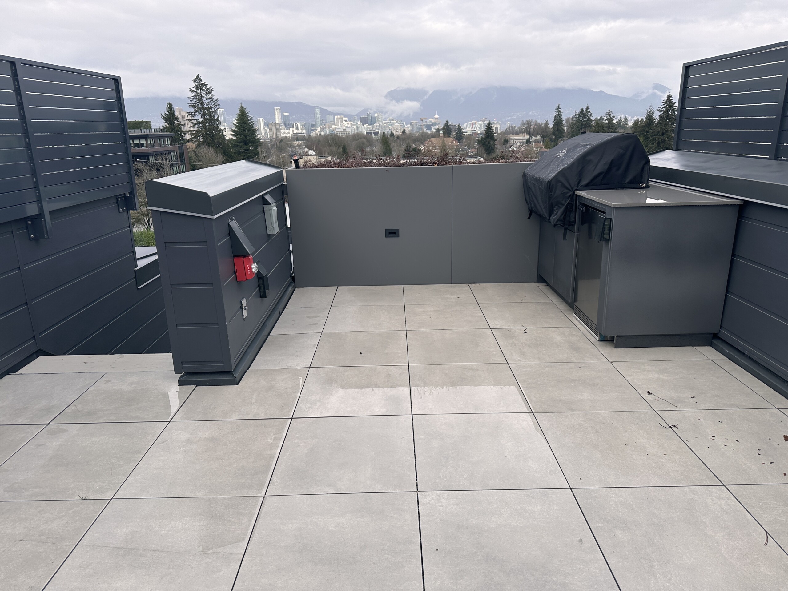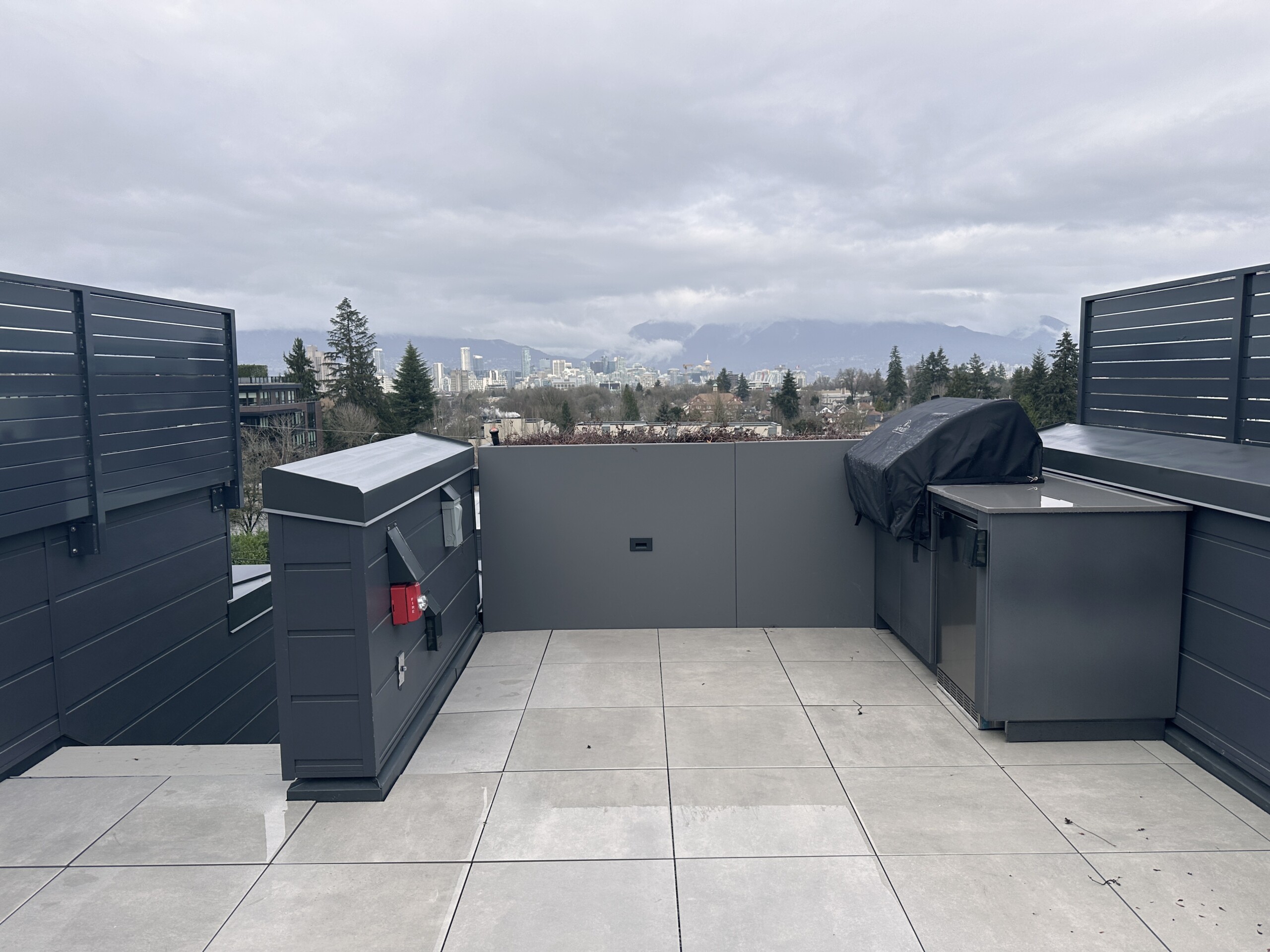 This 5 level townhome features wide plank engineered wood flooring throughout, large windows with roller blinds, 9’ ceilings on main floors, built in wet bar with wine fridge in living room, a high-end kitchen with integrated Miele appliances: fridge, gas cook top, oven, dishwasher, and microwave. Quartz waterfall island, quartz countertops and backsplash, under cabinet lighting, and plenty of storage, a powder room on main floor, spa-like bathrooms with high end finishes, a 4th room suitable size for office or nursery, basement flex space – suitable for den, larger office, storage, and more. It also has a smart home package with touchscreen and Alfred Lock system, 3 outdoor spaces (485 sq ft total), front entrance patio, 3rd floor balcony, and rooftop patio, rooftop patio has views of North Shore Mountains, outdoor kitchen, plus water and gas hookups, this home has central air-conditioning & heating, plenty of closet space throughout home, and direct access to the secured underground parking from the unit’s basement entrance, as well as in-suite washer and dryer.