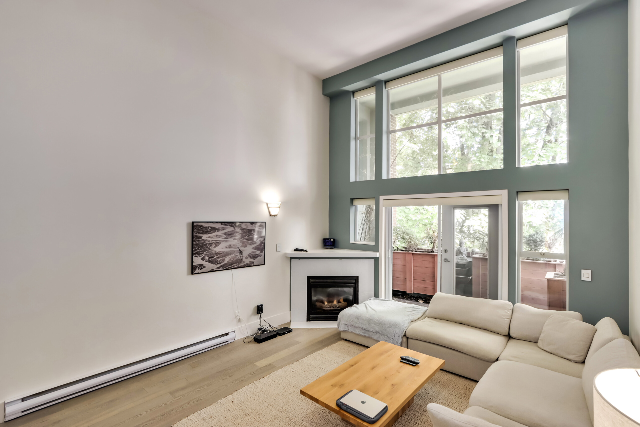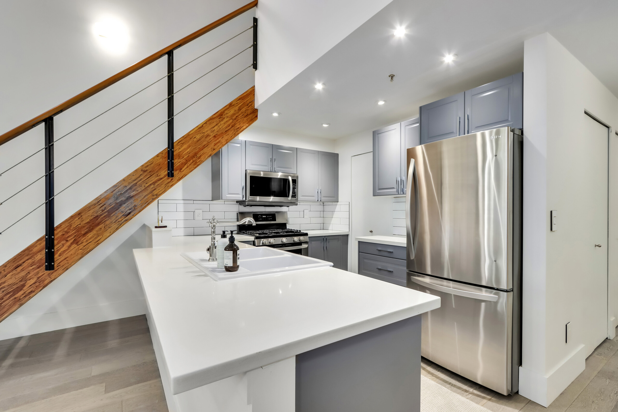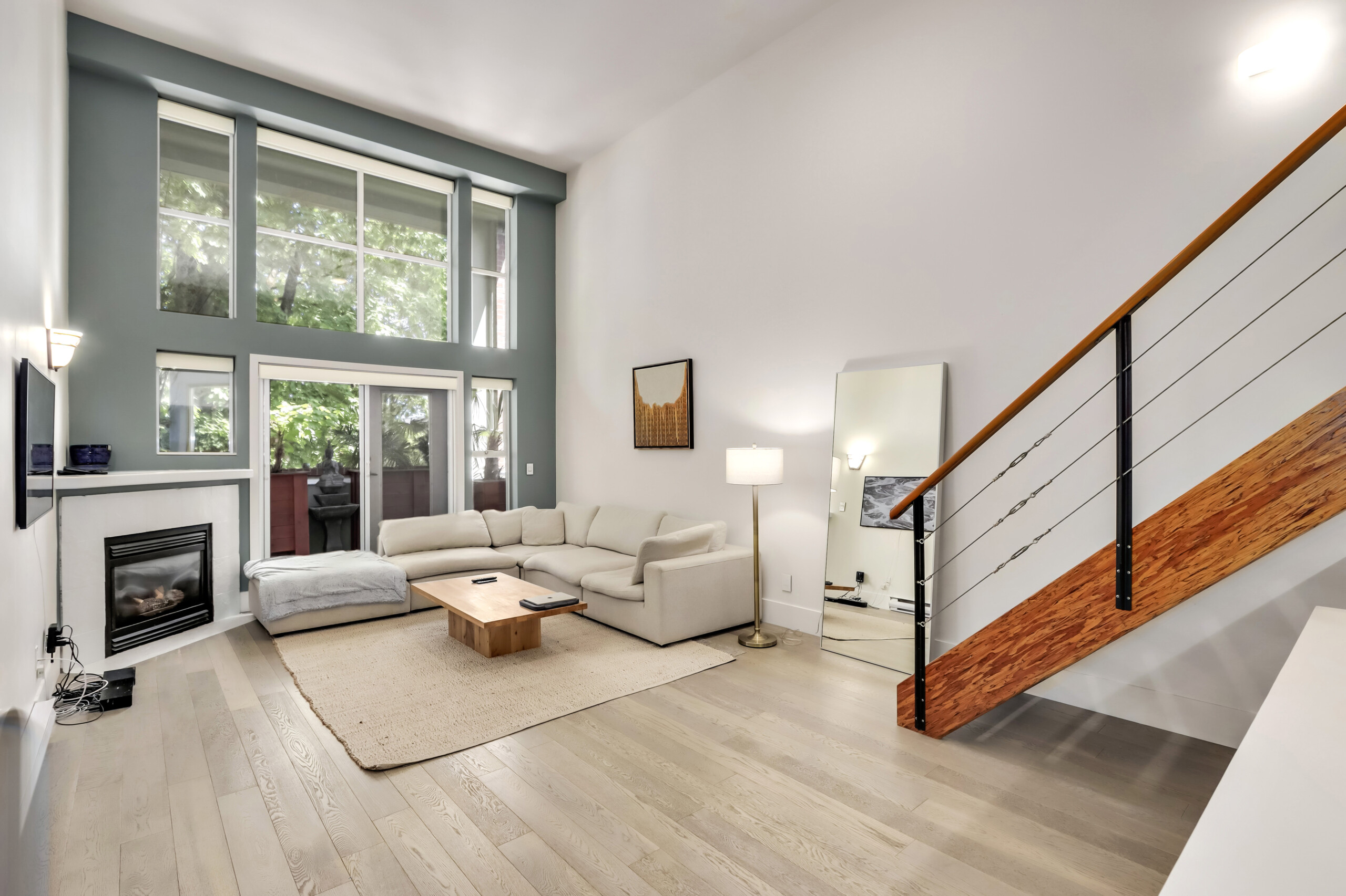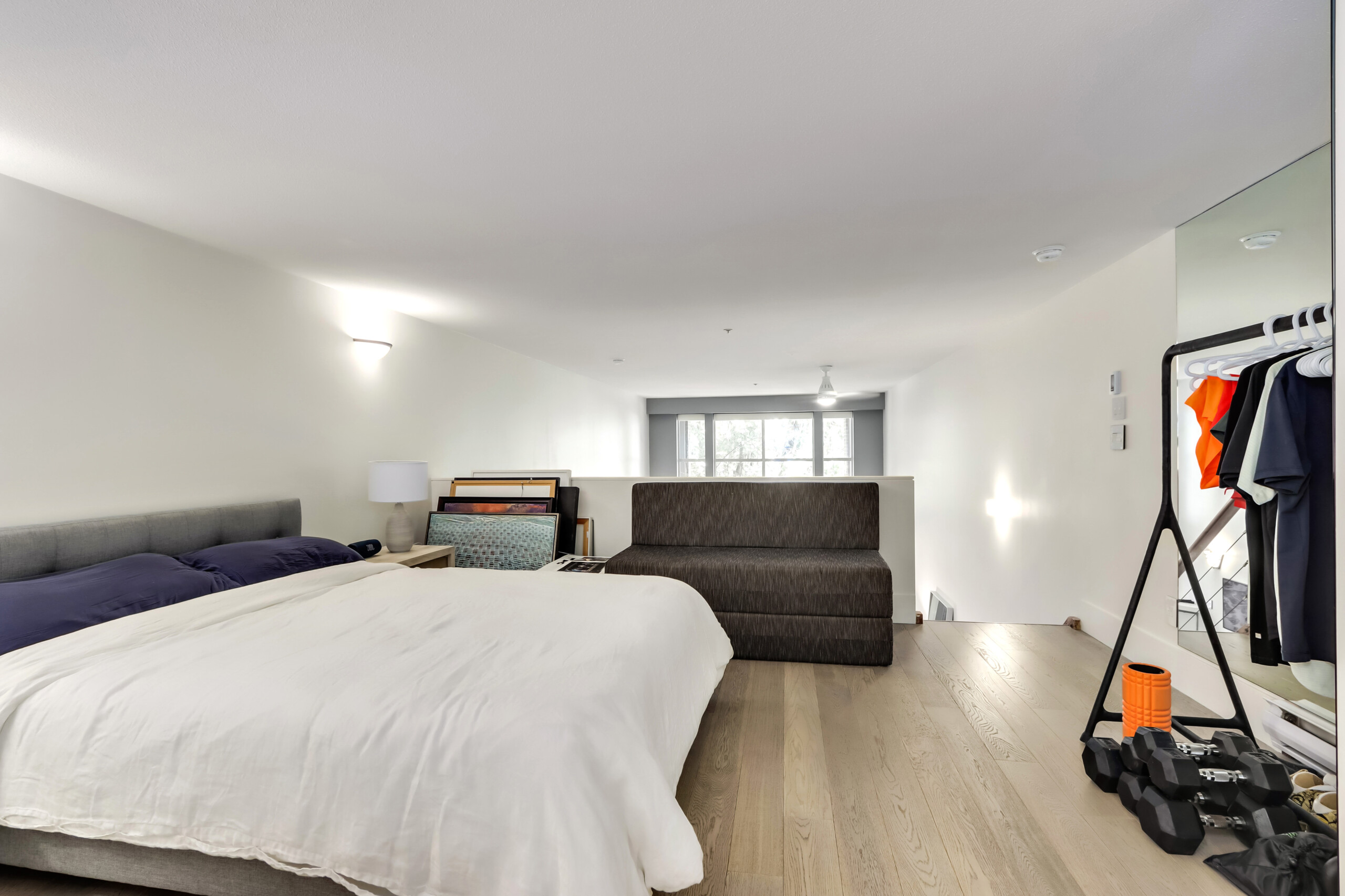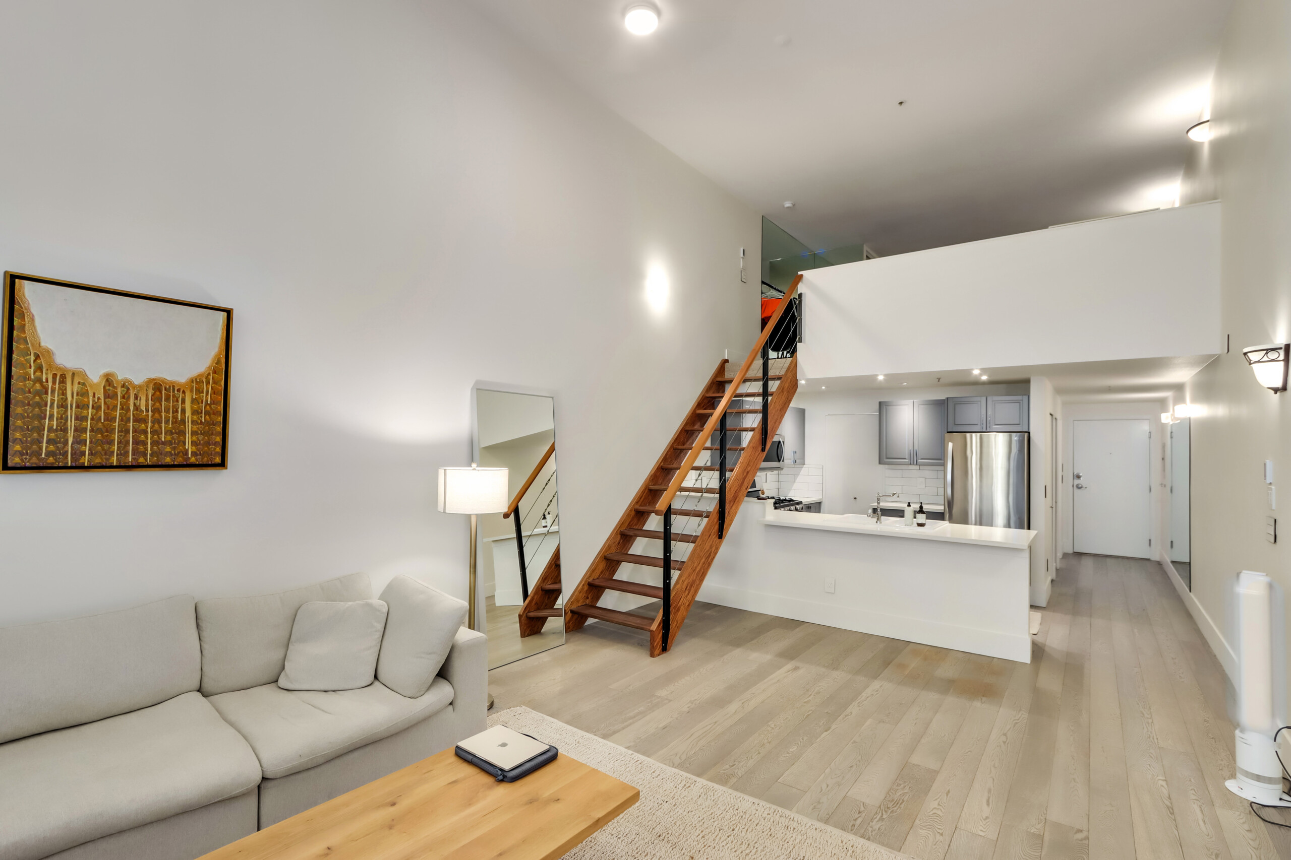 Features in this unique loft space include soaring 16’ ceilings, large living space, cozy gas fireplace, king-sized loft bedroom with 2 closets and powder room, modern open plan kitchen with ample storage space and new countertops, stainless steel appliances including: Fridge, stove, over-range microwave, and dishwasher, large pantry space, private patio with planters and small Buddha fountain, and in-suite washer & dryer