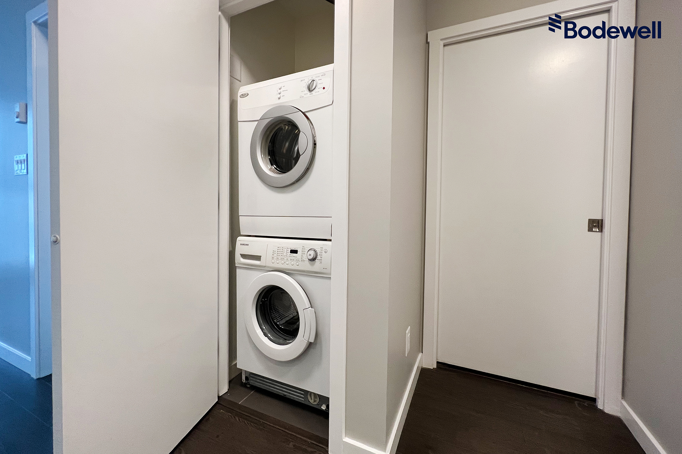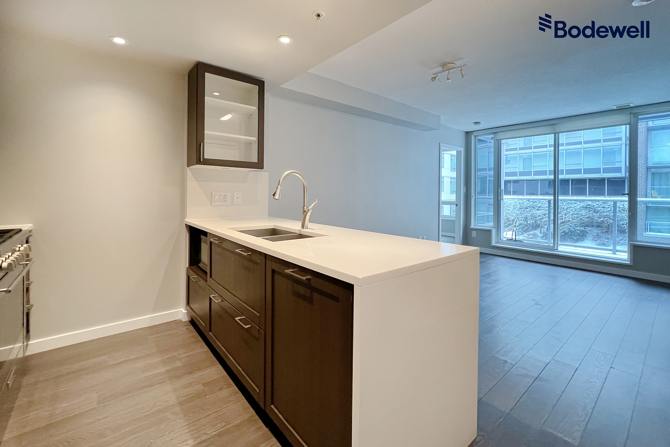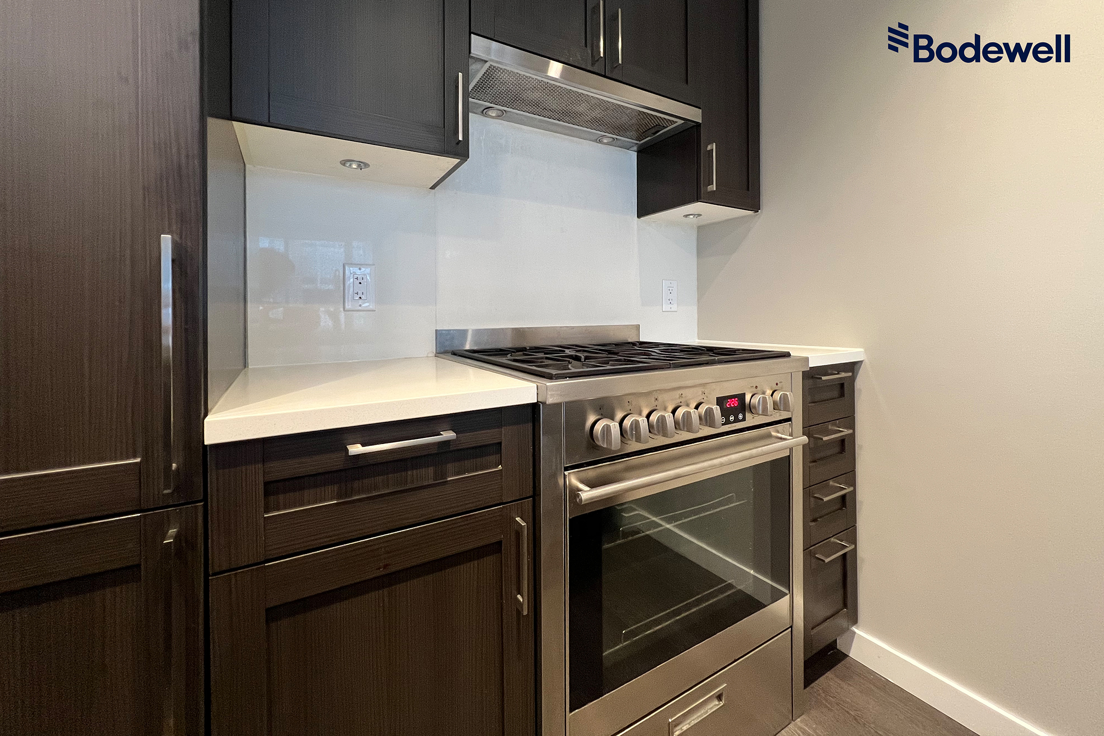 Features include freshly painted walls, laminate wood flooring in living area, modern Kitchen with island and quartz counter tops, full-size Stainless-steel appliances: fridge, gas stove & oven, dishwasher, and microwave, primary Bedroom with a walk-in closet and pocket door entrance to the bathroom, covered balcony, and in-suite washer and dryer.