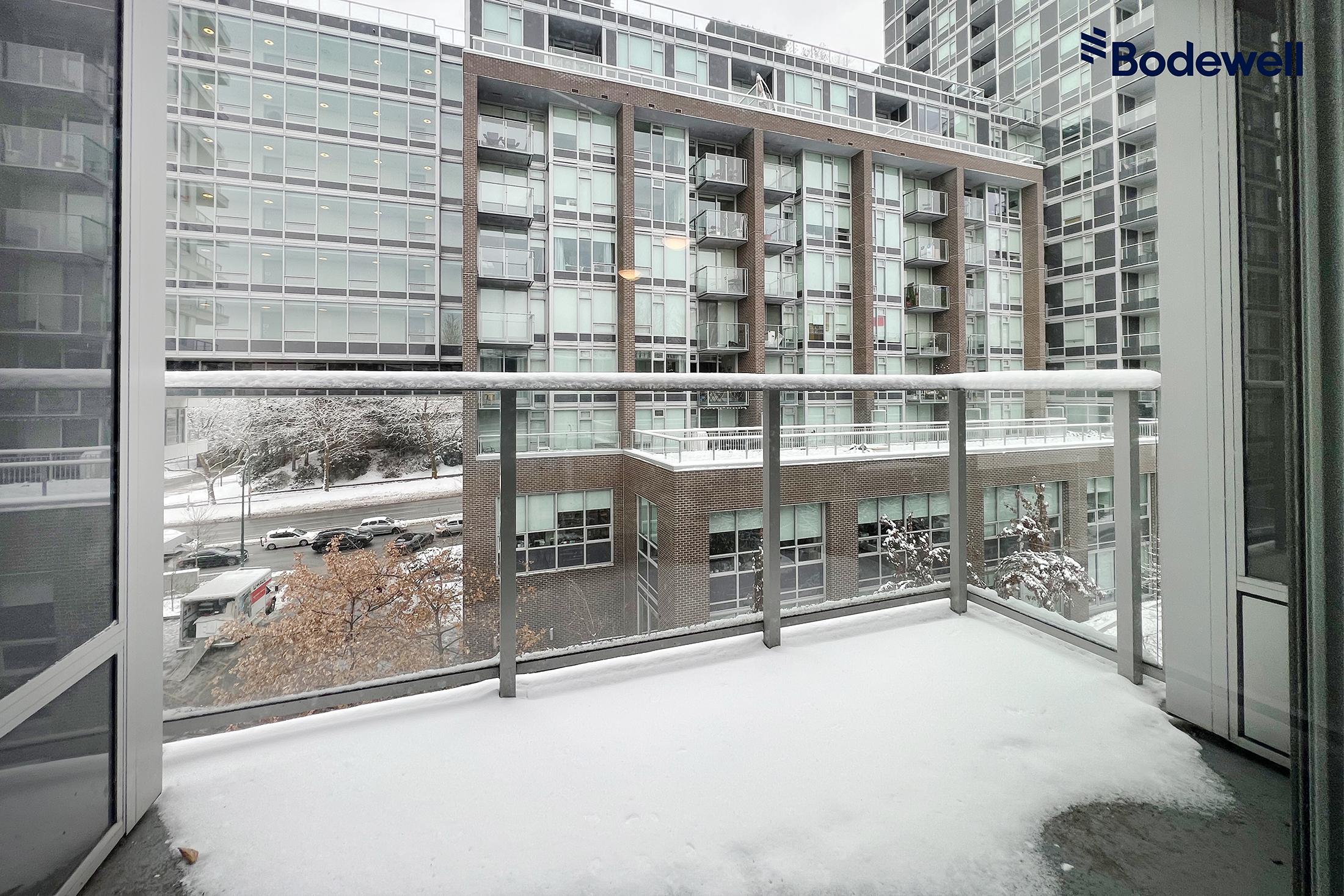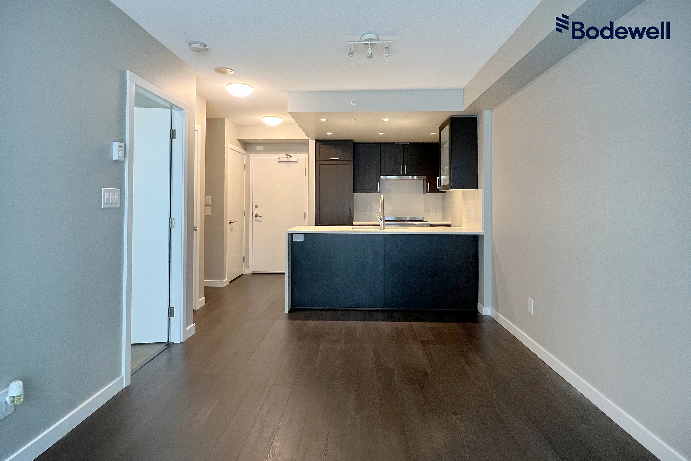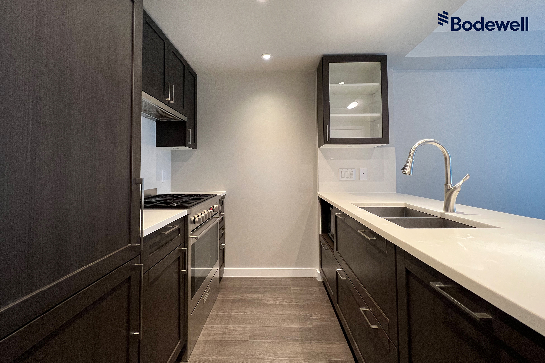 Features include freshly painted walls, laminate wood flooring in living area, modern Kitchen with island and quartz counter tops, full-size Stainless-steel appliances: fridge, gas stove & oven, dishwasher, and microwave, primary Bedroom with a walk-in closet and pocket door entrance to the bathroom, covered balcony, and in-suite washer and dryer.