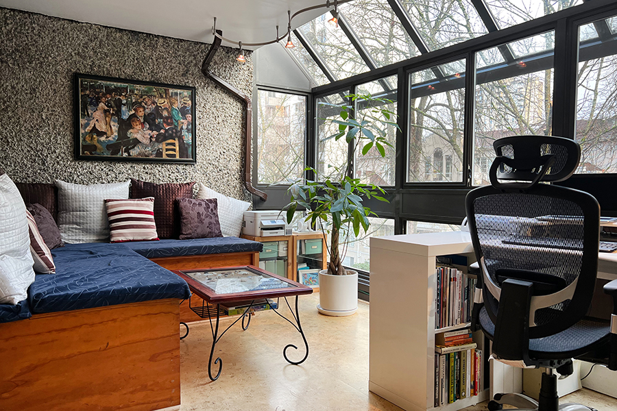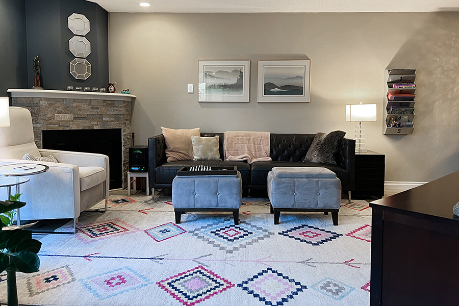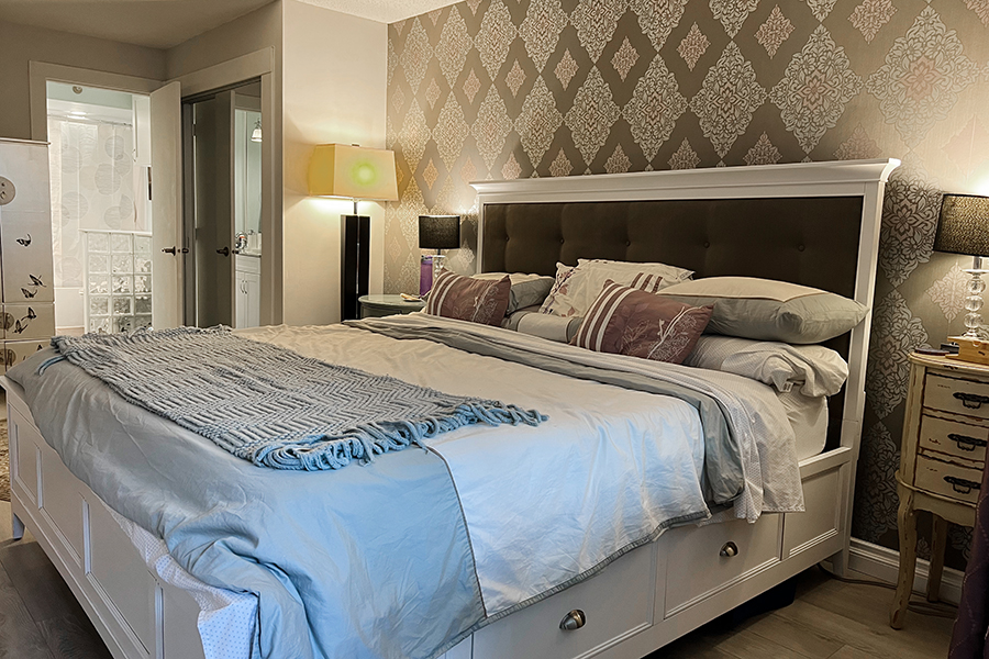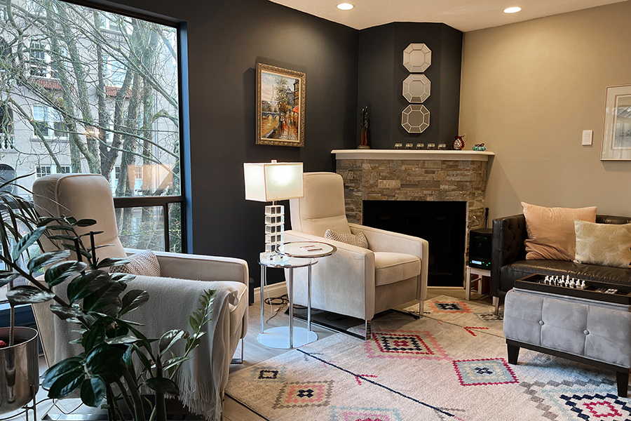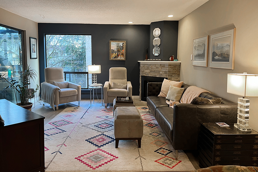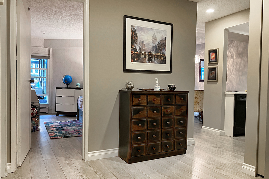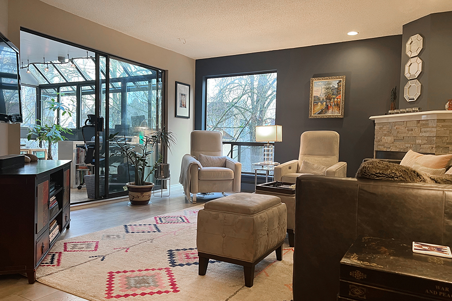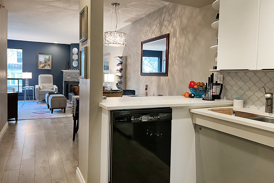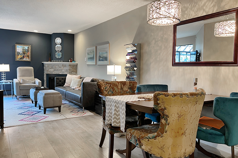 Features include spacious primary Bedroom with ensuite bathroom, engineered laminate flooring throughout, full size appliances: fridge, stove, wall oven, microwave and dishwasher, quartz counter-tops, wood burning fireplace, enclosed balcony with built-in seating and storage below, and in-suite washer and dryer.