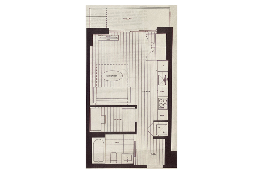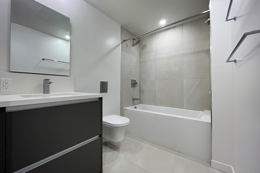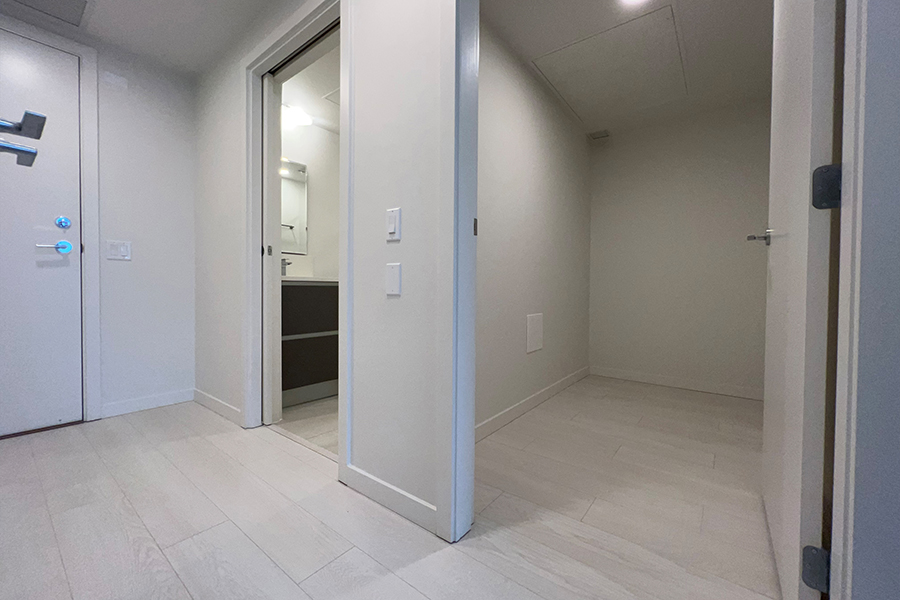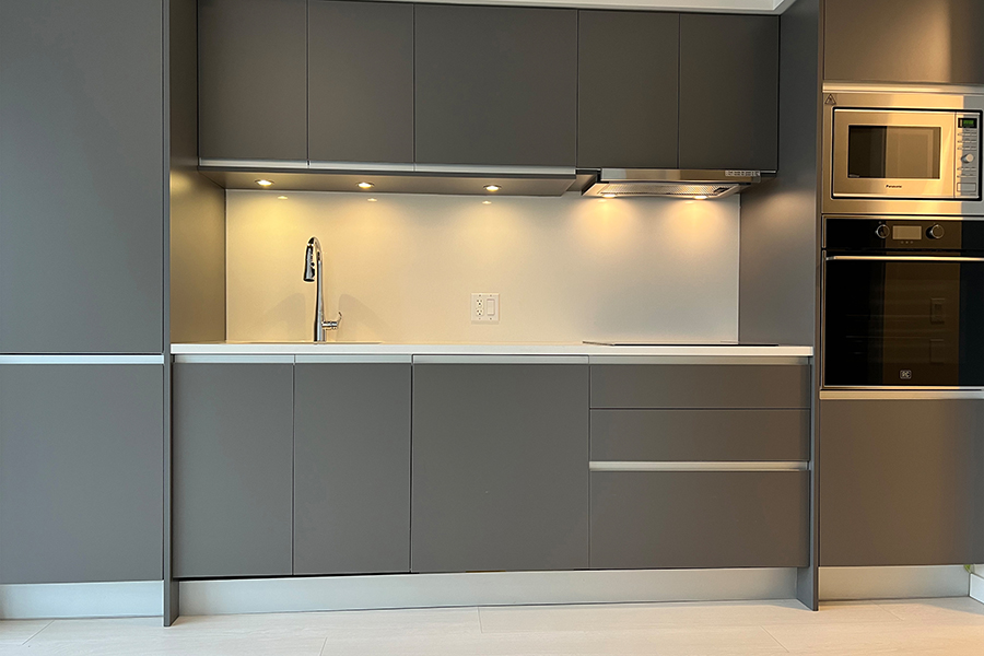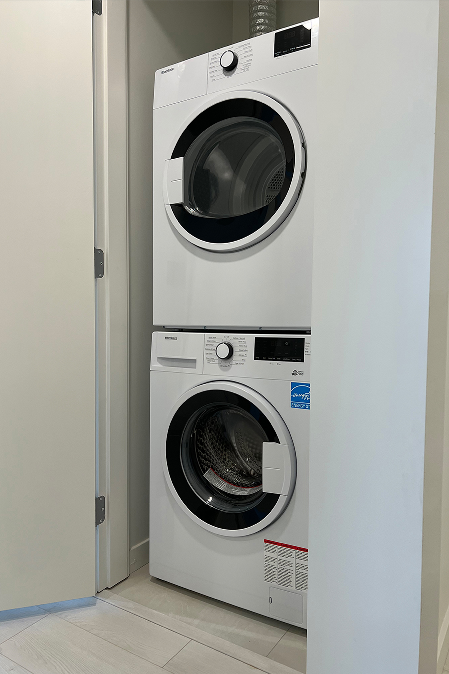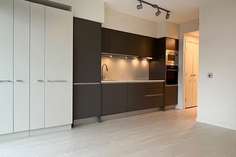 Features include central heating & cooling (air-conditioning), integrated and stainless-steel appliances: fridge, induction stove, wall oven, dishwasher, and microwave, custom matte cabinets and closets, quartz counter-tops, wide plank engineered flooring throughout, spa-bathroom with large porcelain tiles and wall-hung latrine, balcony, and in-suite washer and dryer.