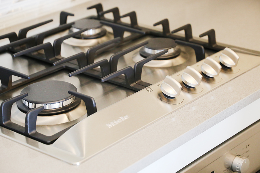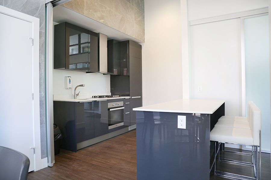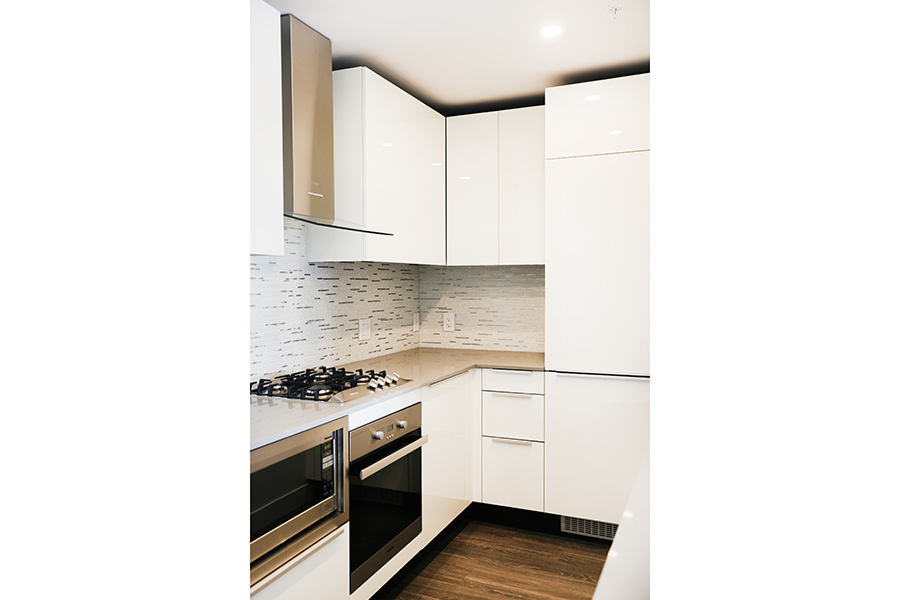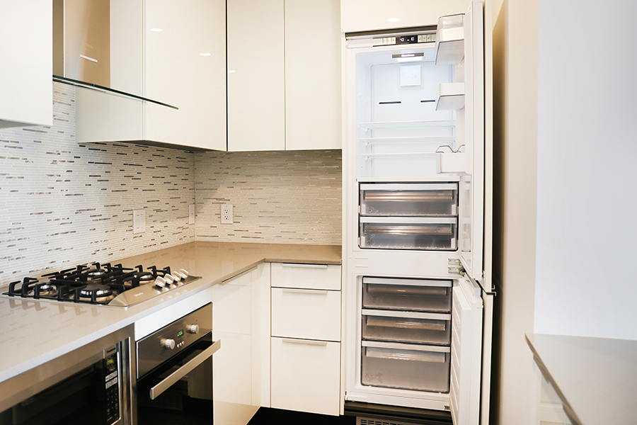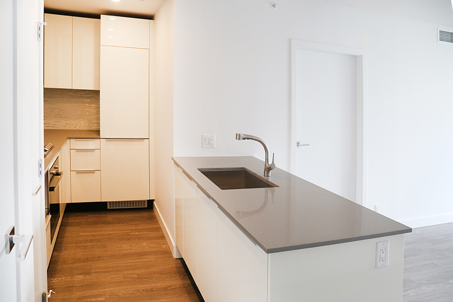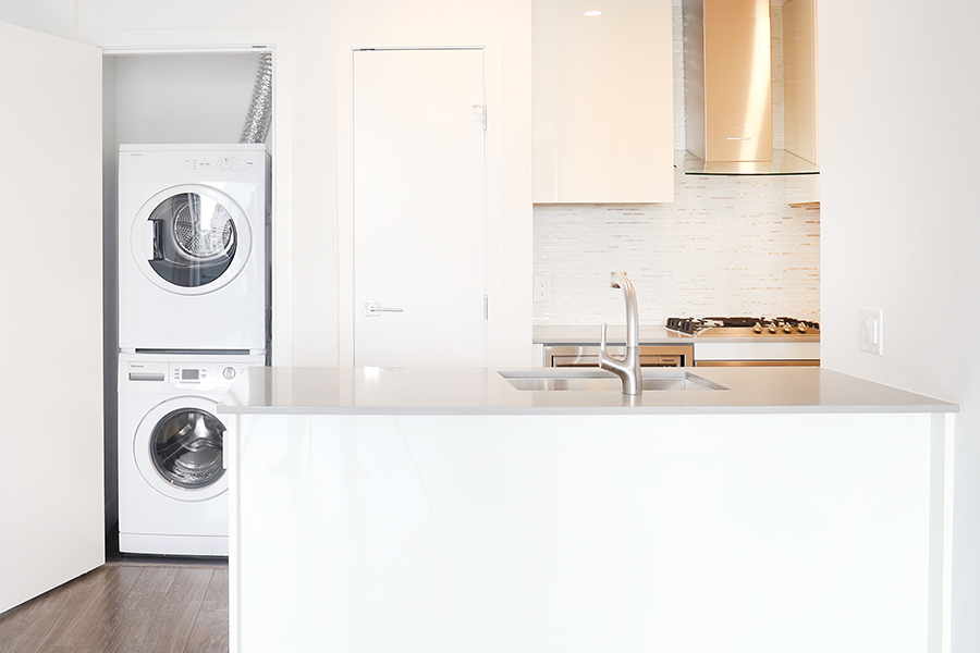 Features in this unit include two south-facing bedrooms, two full bathrooms, laminate flooring throughout the home, open plan kitchen with European cabinetry systems, elegant polished-edge quartz countertops & kitchen island peninsula, stainless steel and integrated appliances: fridge, Miele gas cook top, oven, dishwasher, and microwave, and in-suite washer and dryer