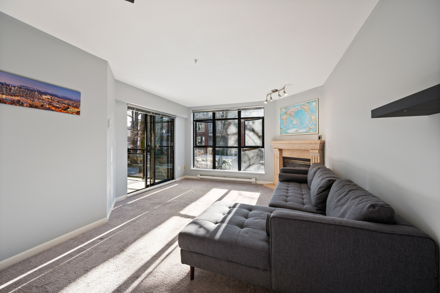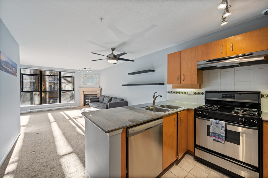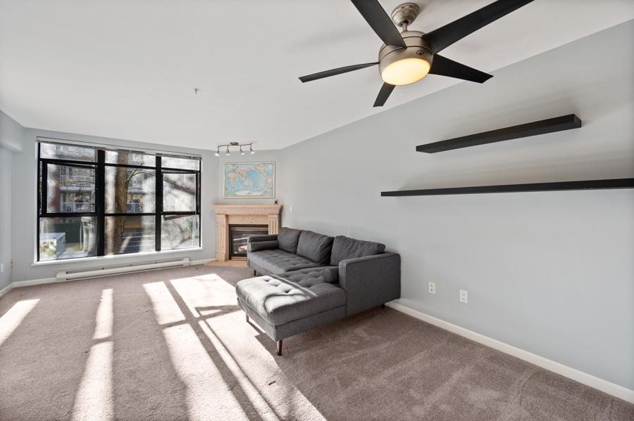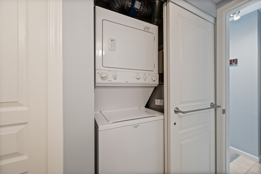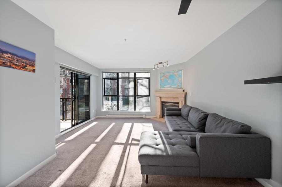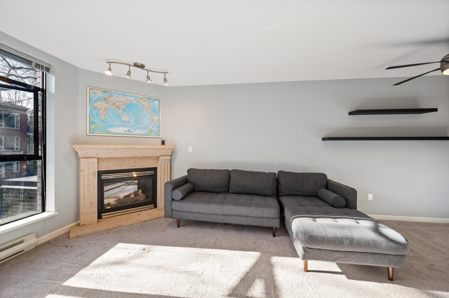 Features in this 2nd floor unit include a gas fireplace, open plan kitchen with granite countertops and stainless steel appliances: fridge, gas stove, and dishwasher, spacious bedroom with direct access to the washroom, den/flex space, private covered balcony, and in-suite washer and dryer
