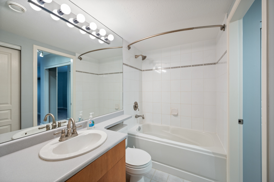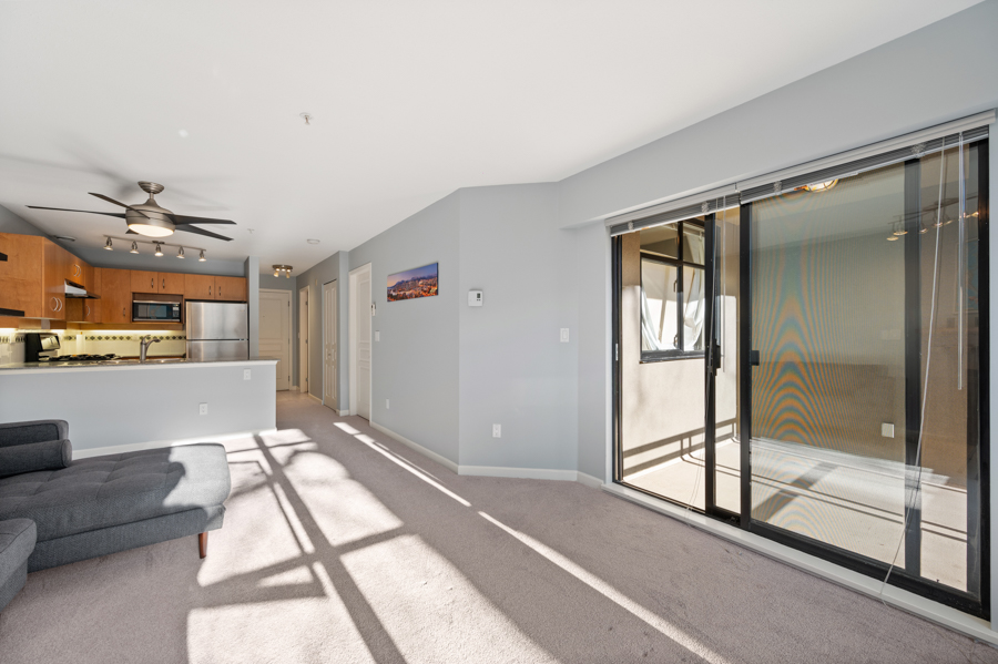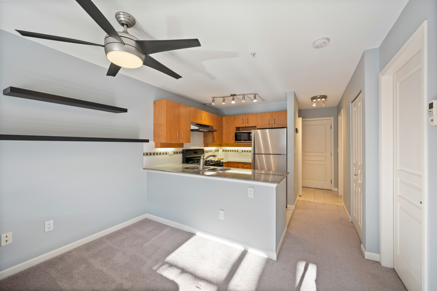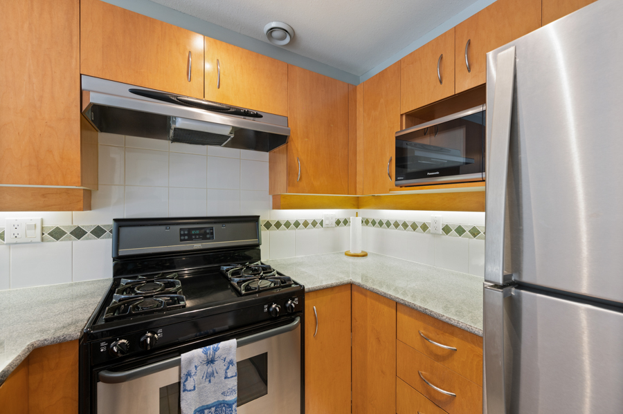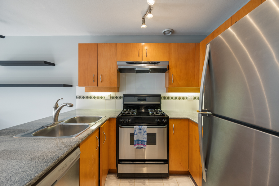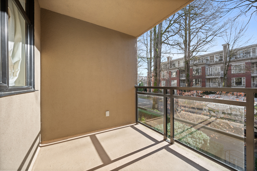 Features in this 2nd floor unit include a gas fireplace, open plan kitchen with granite countertops and stainless steel appliances: fridge, gas stove, and dishwasher, spacious bedroom with direct access to the washroom, den/flex space, private covered balcony, and in-suite washer and dryer