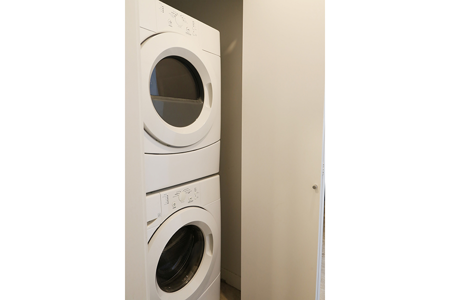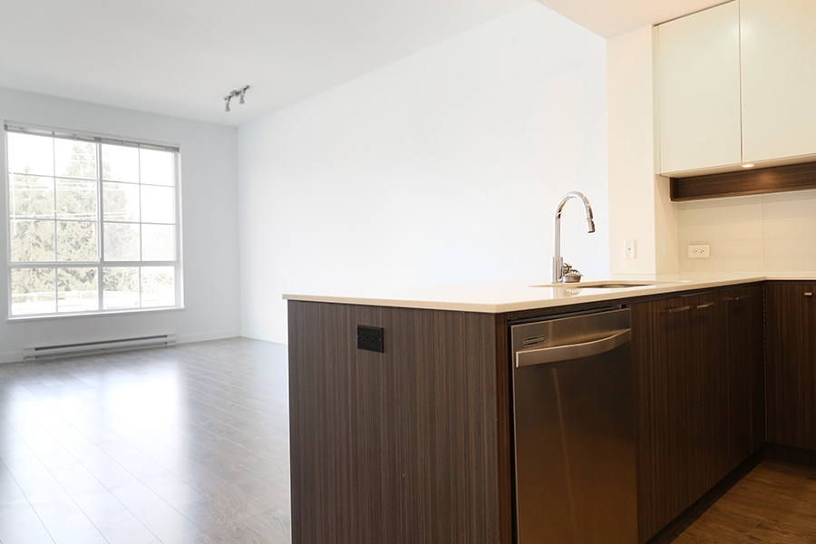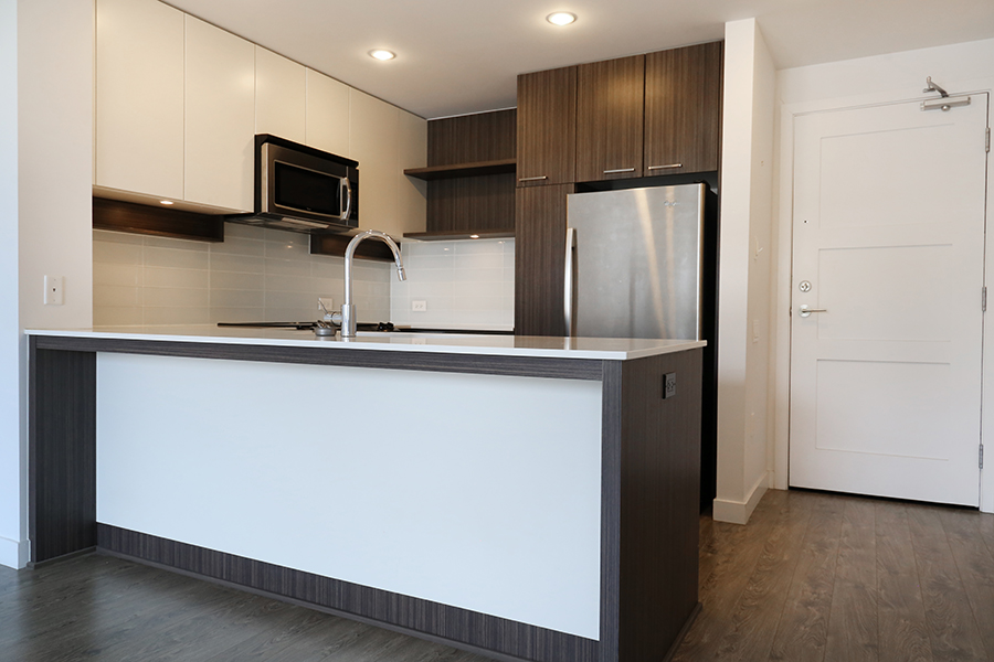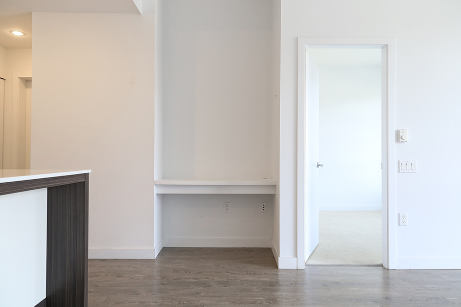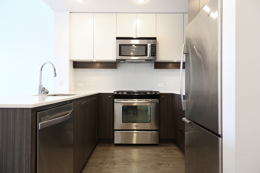 Features in this top floor unit include, open plan living, oversized windows & 10’ ceilings to allow plenty of natural light, full-size stainless steel appliances: Refrigerator, Dishwasher, Stove, Oven, and Microwave, large kitchen island peninsula with quartz countertops, nook with built-in desk, engineered wood flooring throughout kitchen, living and dining, primary ensuite bathroom, private balcony, and in-suite washer and dryer.
