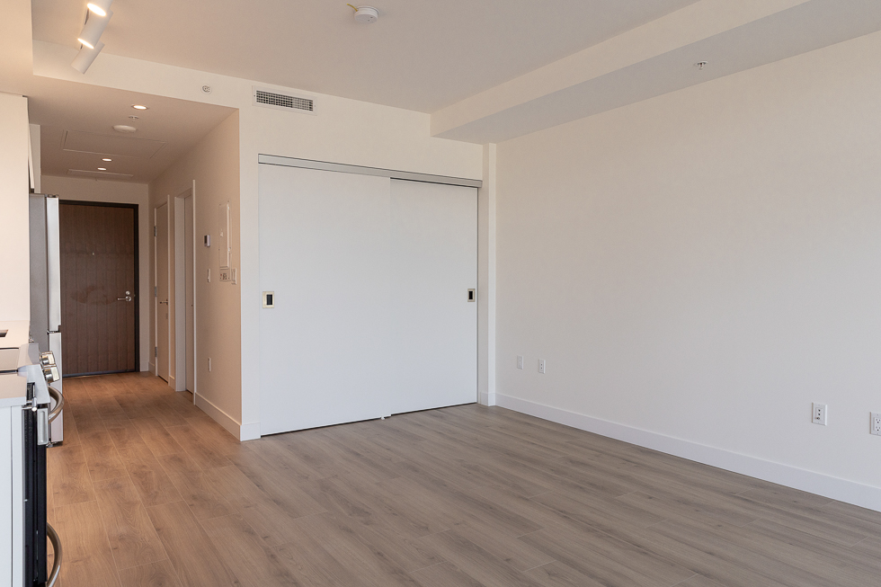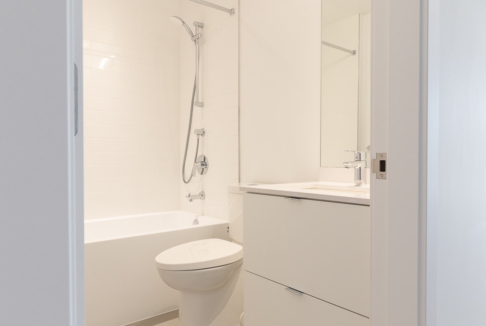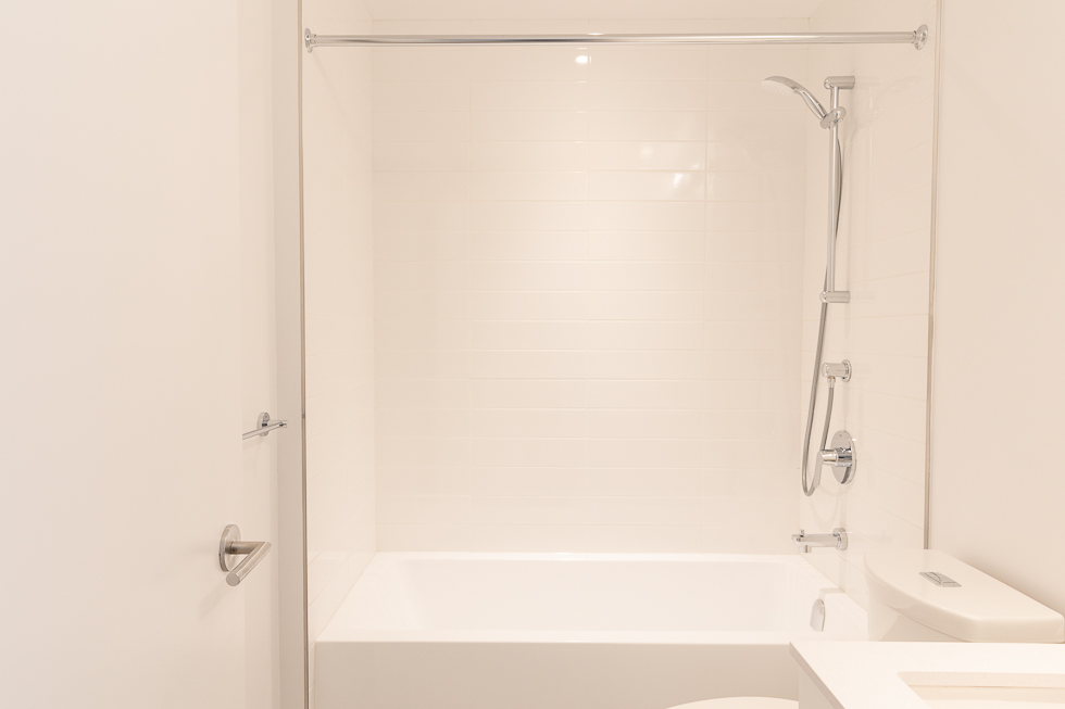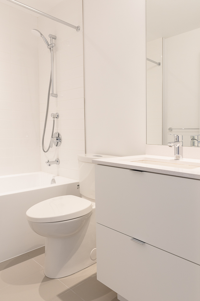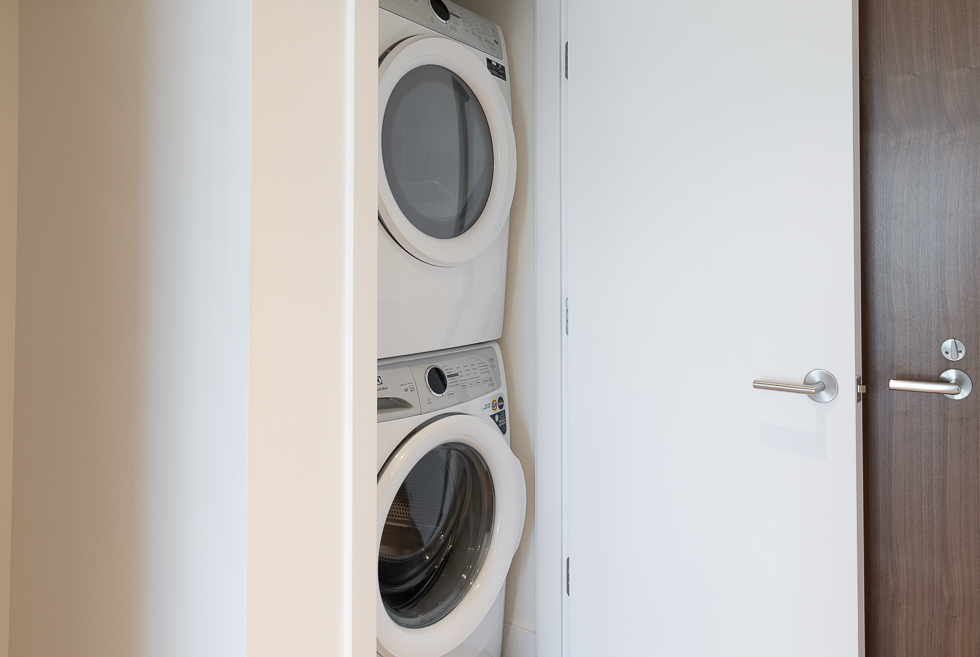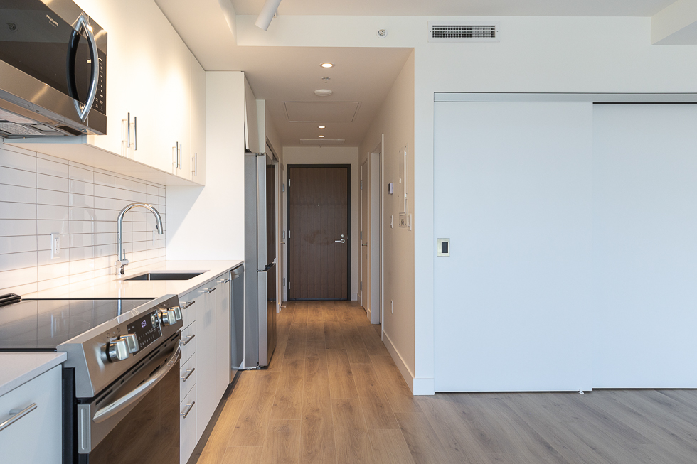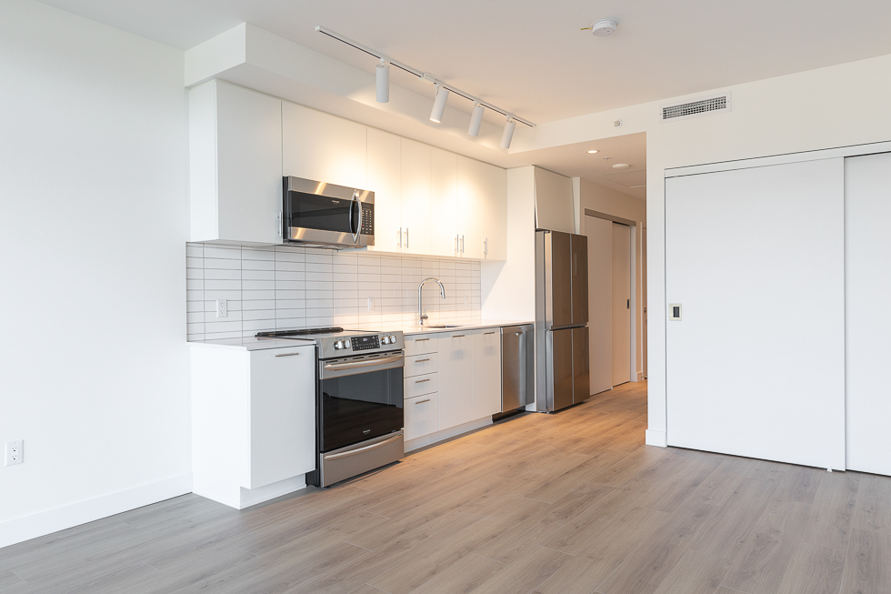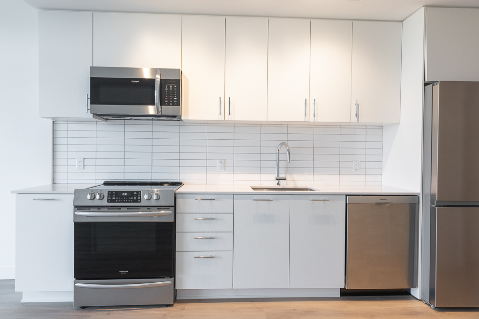 Features in this brand new unit include Air Conditioning, floor to ceiling windows, bright and modern kitchen with quartz counter tops and white subway tile backsplash, full-size stainless-steel appliances, wide plank laminate flooring throughout, covered balcony, and in-suite washer and dryer