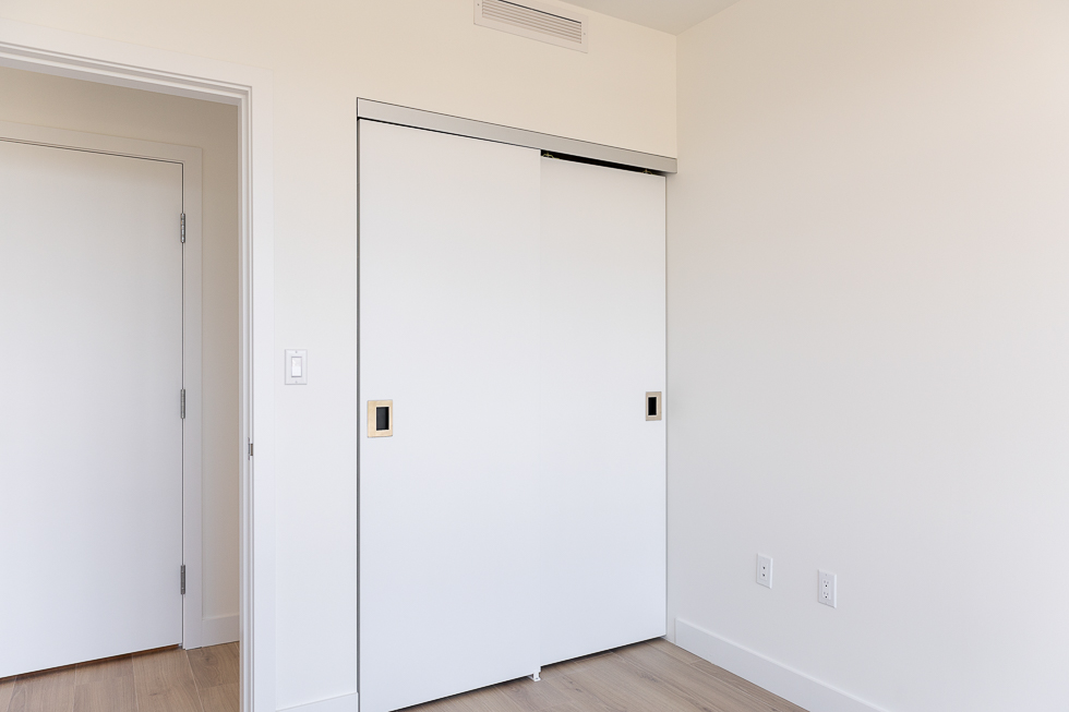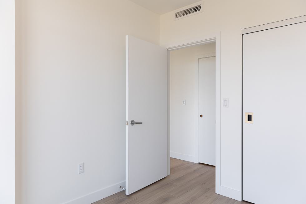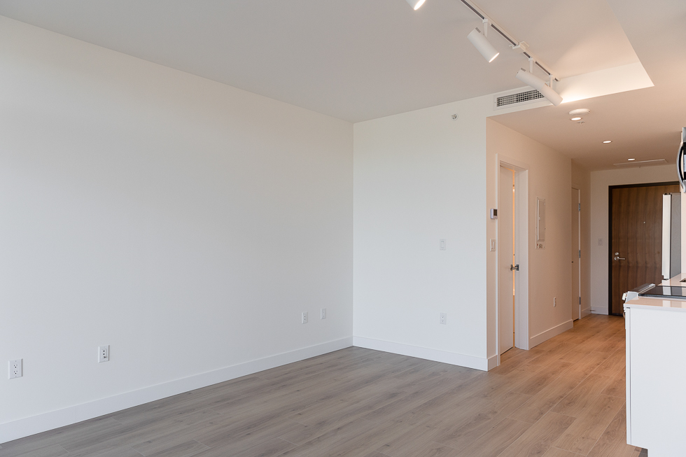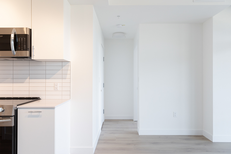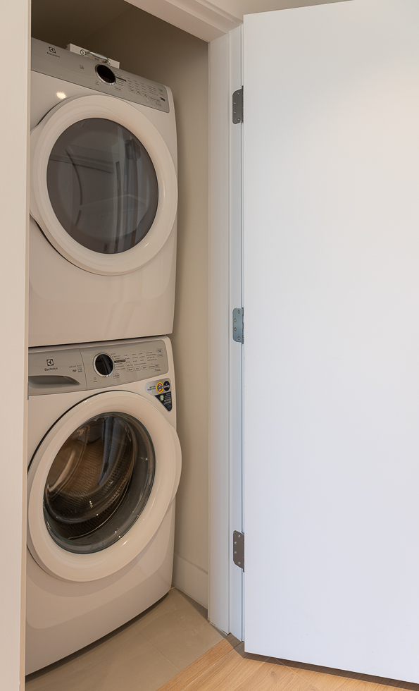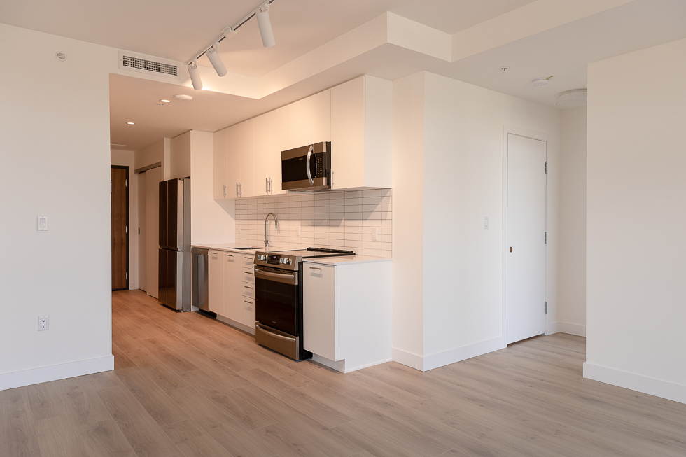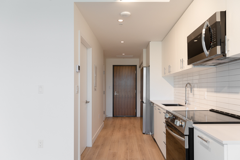Features in this brand new unit include Air Conditioning, floor to ceiling windows, bright and modern kitchen with quartz counter tops and white subway tile backsplash, full-size stainless-steel appliances, wide plank laminate flooring throughout, covered balcony, and in-suite washer and dryer