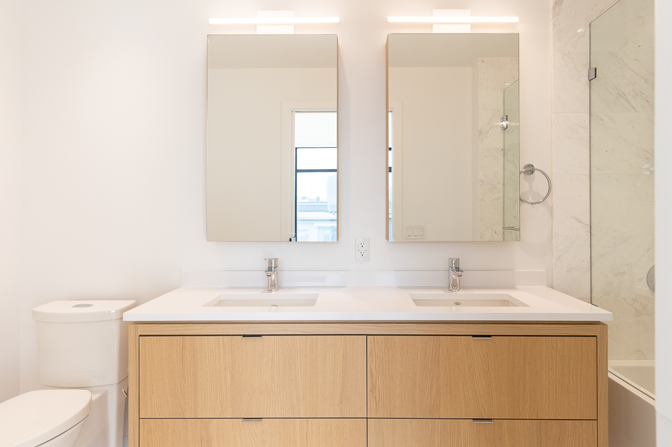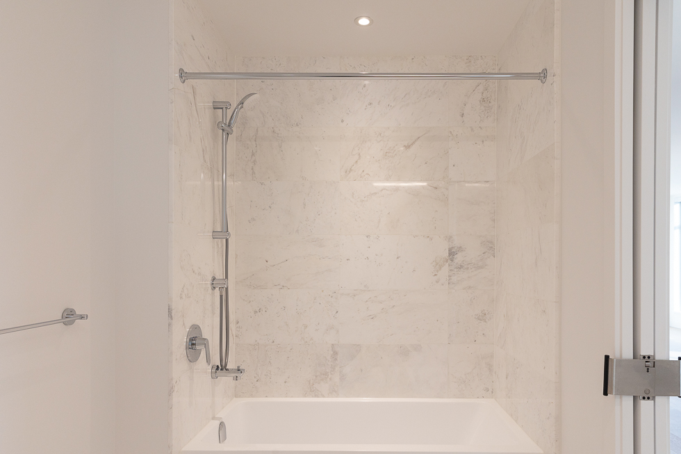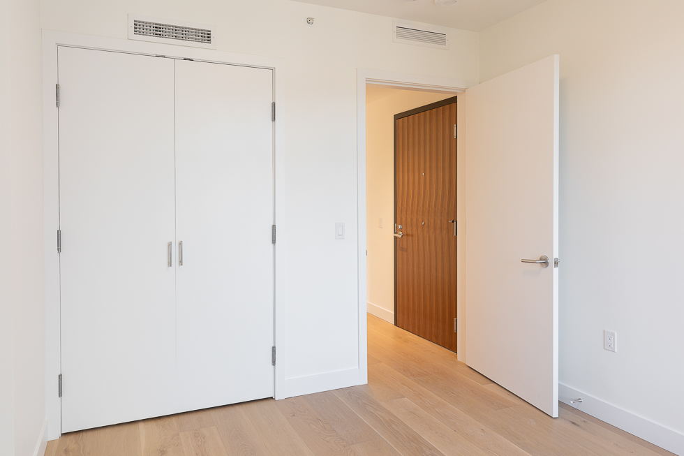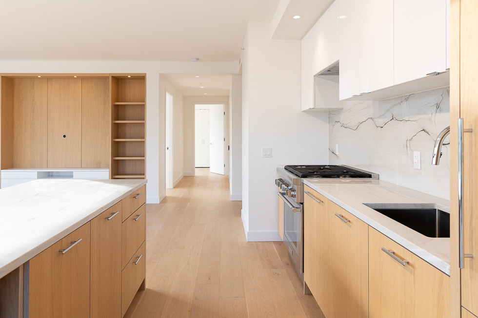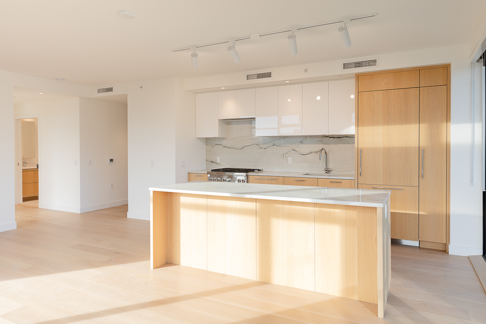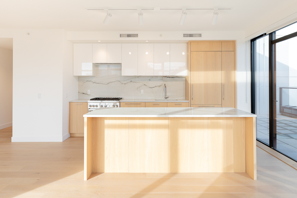 Features in this brand new unit include air conditioning, floor to ceiling windows, Northeast orientation with stunning views of the mountains from the living area and patio, custom millwork built-ins in living room, bright & modern entertainer’s kitchen with quartz countertops and marble backsplash, full size stainless steel and integrated appliances, wide plank hardwood flooring throughout, a large patio, and in-suite washer and dryer.