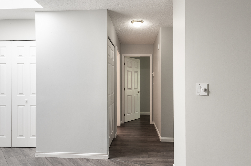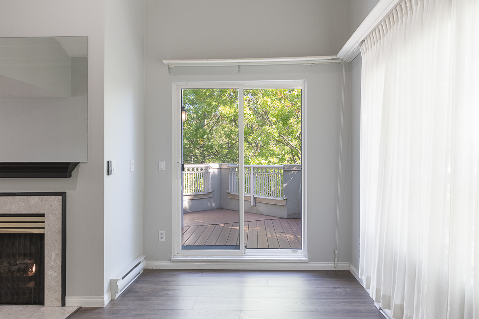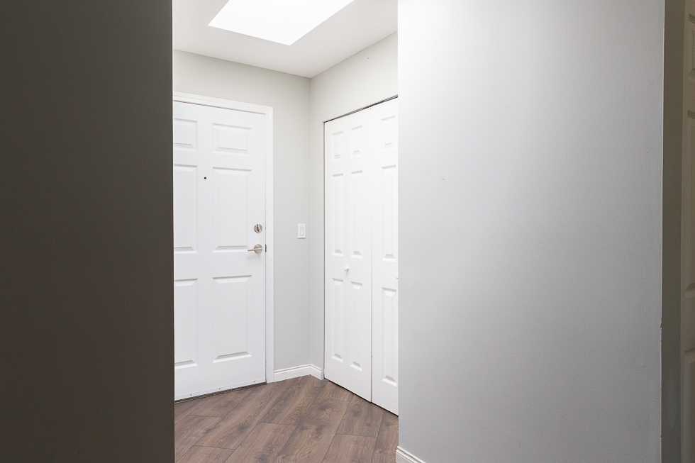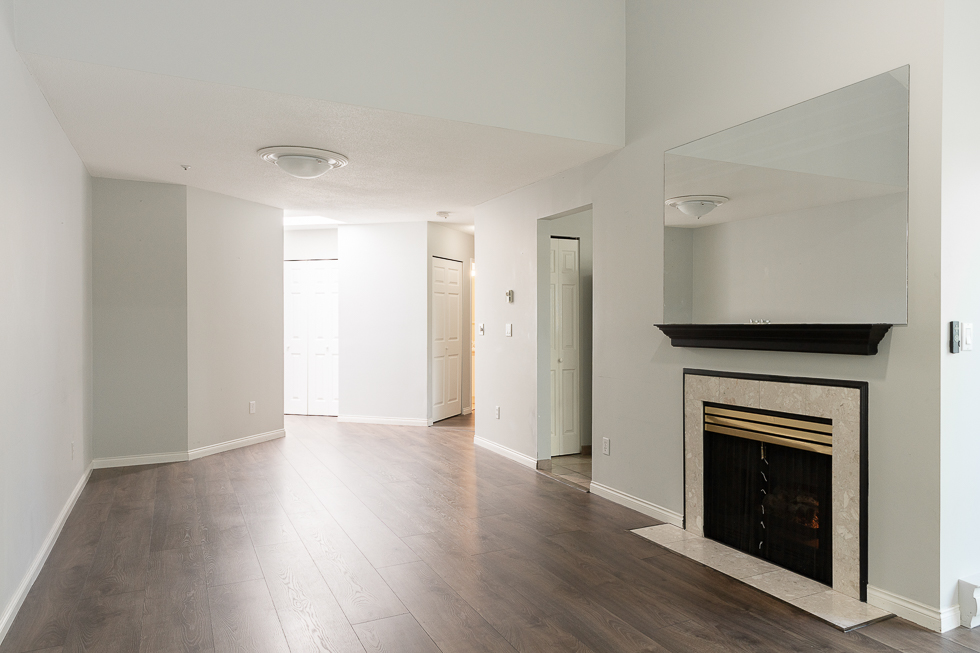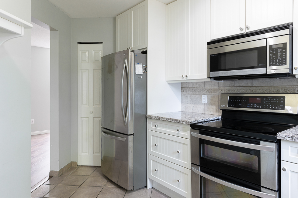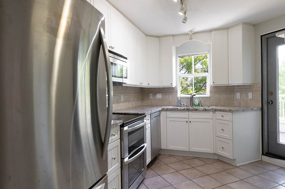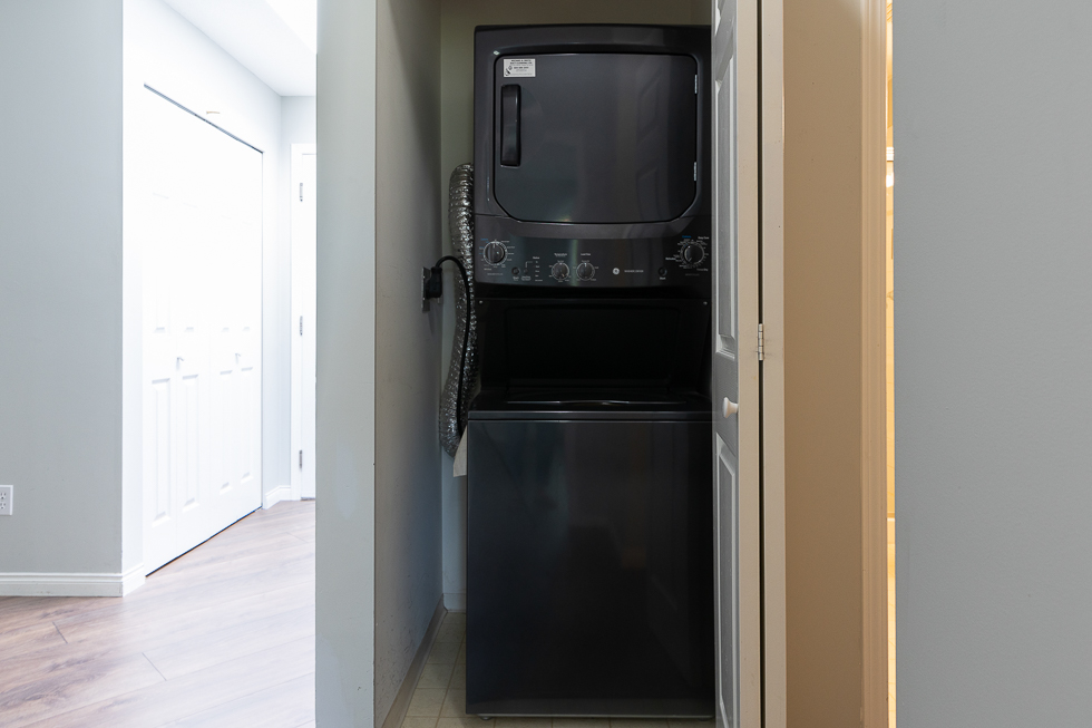 Features in this top floor unit with large private patio include a bright airy kitchen with tile flooring and direct access to patio, full-size Stainless-steel appliances, spacious living room with vaulted ceilings and direct access to patio, laminate flooring throughout living areas and bedrooms, primary bedroom with ensuite bathroom and walk-in closet, and in-suite washer and dryer