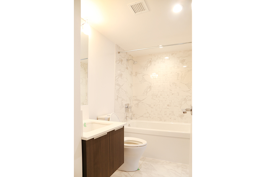 Features in this Jr. one bedroom include frosted glass sliding doors, one bedroom with frosted glass sliding doors, wheelchair accessible bathroom, laminate flooring throughout living areas, open plan kitchen with European cabinetry systems, elegant polished-edge quartz countertops, stainless steel and integrated appliances: fridge, stove/oven, dishwasher, and microwave, in-suite washer and dryer, and large flex space, perfect as an office or storage room.