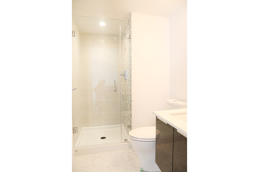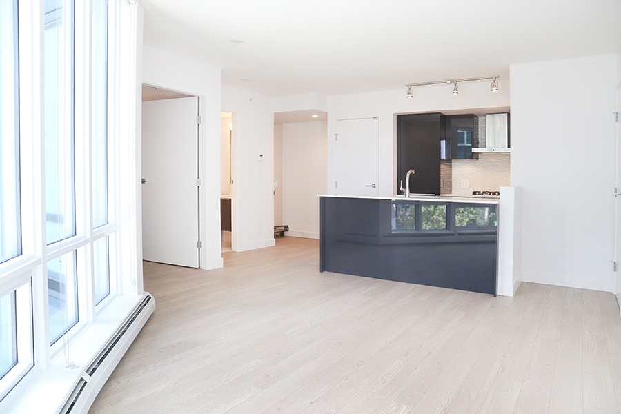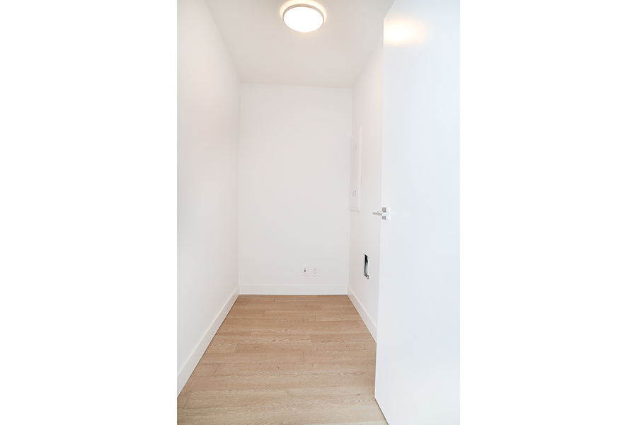 Features include Two bedroom corner unit with expansive windows, wheelchair accessible ensuite bathroom, laminate flooring throughout living areas, plush carpet in bedrooms, open plan kitchen with European cabinetry systems, elegant polished-edge quartz countertops, stainless steel fridge, stove/oven, dishwasher, and microwave, In-suite washer and dryer, and a large flex space, perfect as an office or storage room