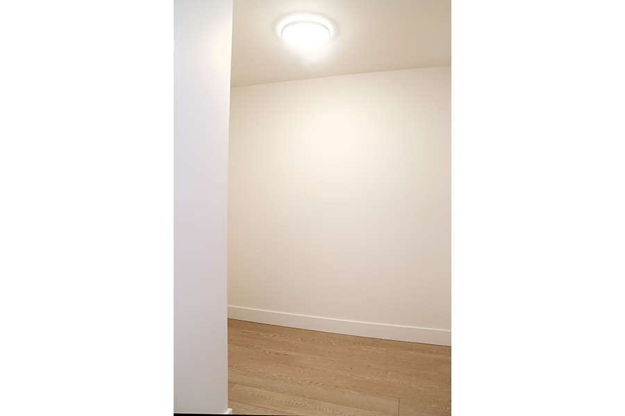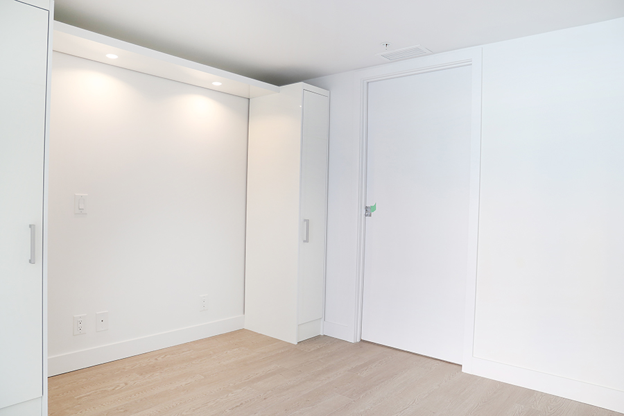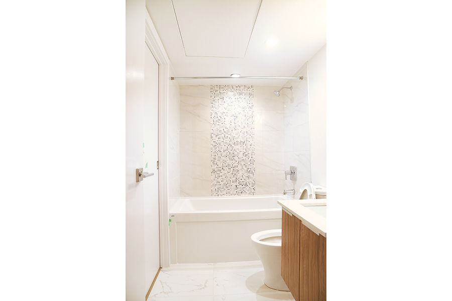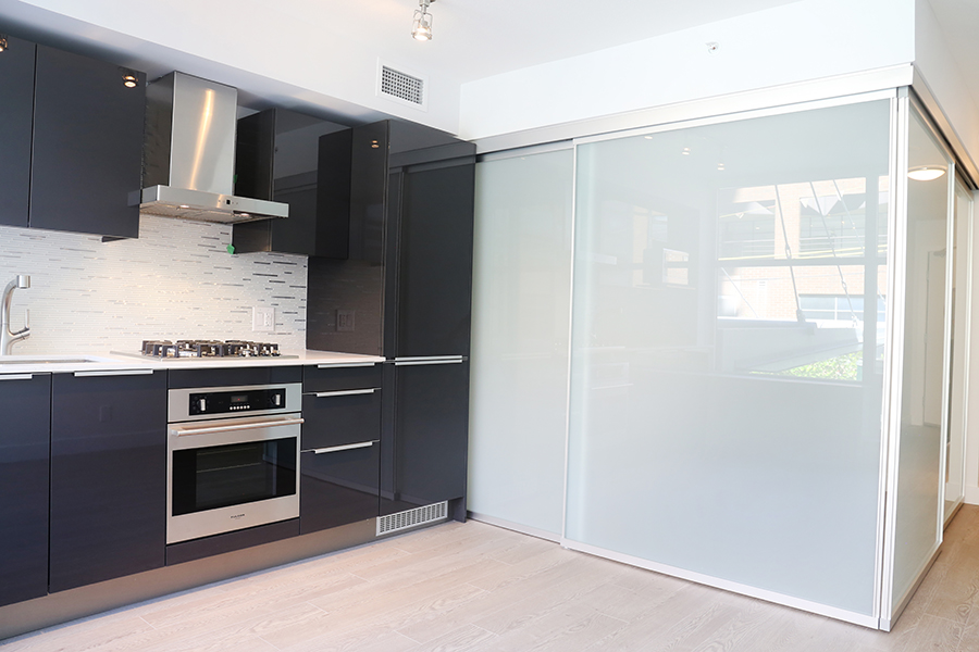 Features in this property include a frosted glass sliding partition, wheelchair accessible bathroom, laminate flooring throughout living areas, open plan kitchen with European cabinetry systems, elegant polished-edge quartz countertops, stainless steel and integrated appliances, in-suite washer and dryer, & a large flex space, perfect as an office or storage room
