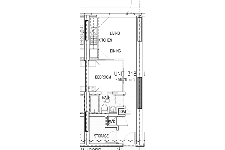 Features in this Jr. one bedroom include frosted glass sliding doors, wheelchair accessible bathroom, laminate flooring throughout living areas, open plan kitchen with European cabinetry systems, elegant polished-edge quartz countertops, stainless steel and integrated appliances: fridge, stove/oven, dishwasher, and microwave, in-suite washer and dryer, and a large flex space (perfect as an office or storage room). Amenities include fireside lounge and library with over-height ceilings, social room with chef’s kitchen and formal dining area