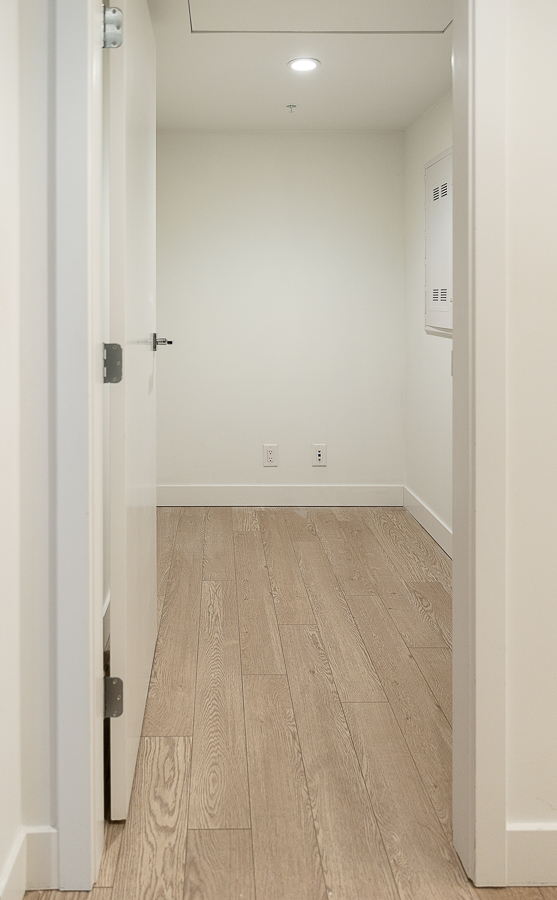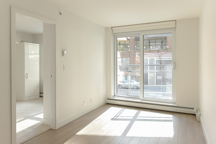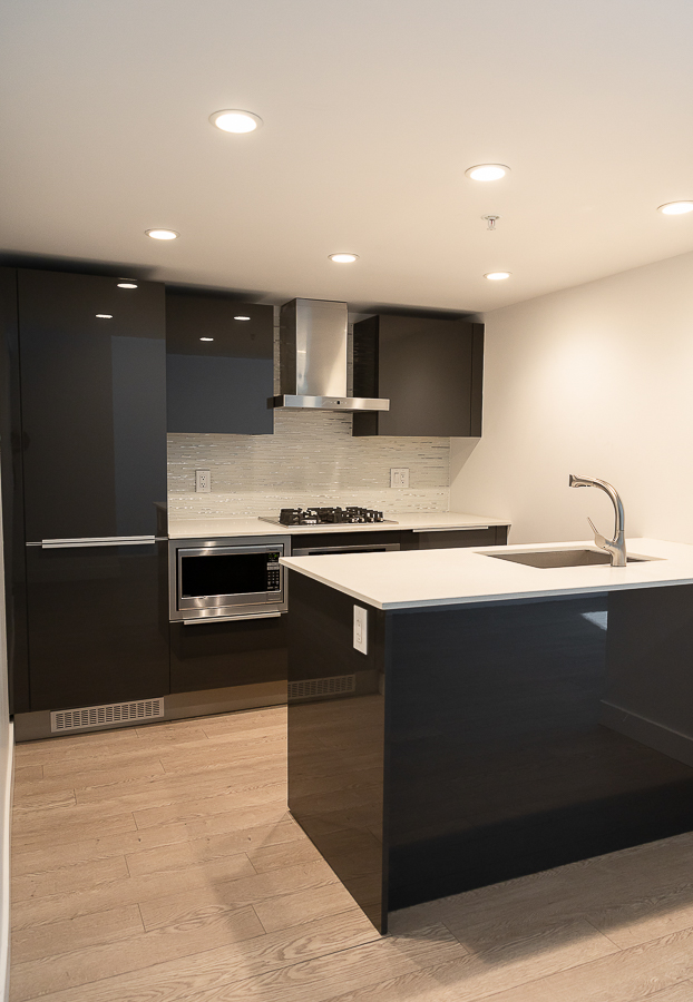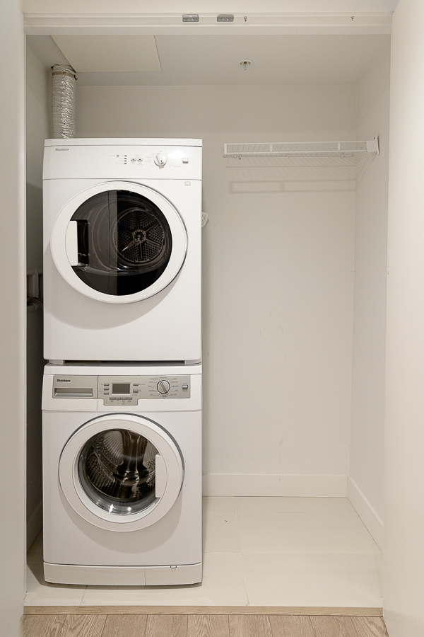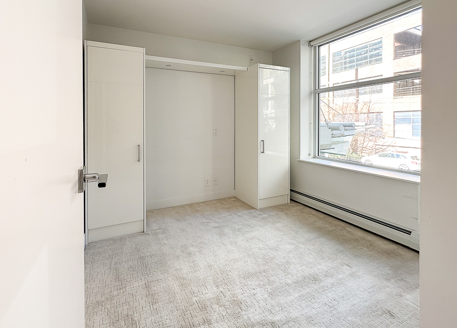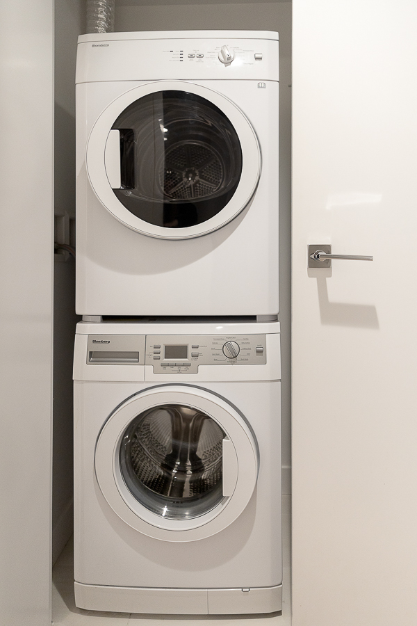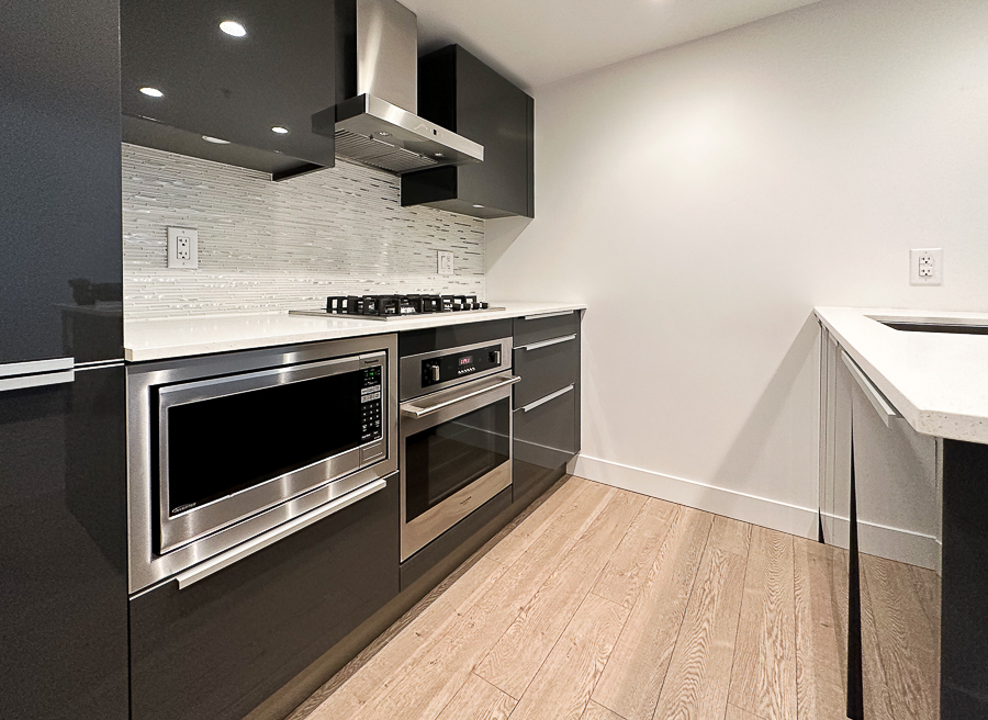 Features in this one bedroom unit include large windows and roller blinds, a 5-piece bathroom with double vanity and a walk-in shower and bathtub, laminate flooring throughout living areas and a carpeted bedroom, modern kitchen with European cabinetry and elegant with polished-edge quartz countertops and integrated stainless steel appliances, in-suite washer and dryer, large flex space, and a small balcony