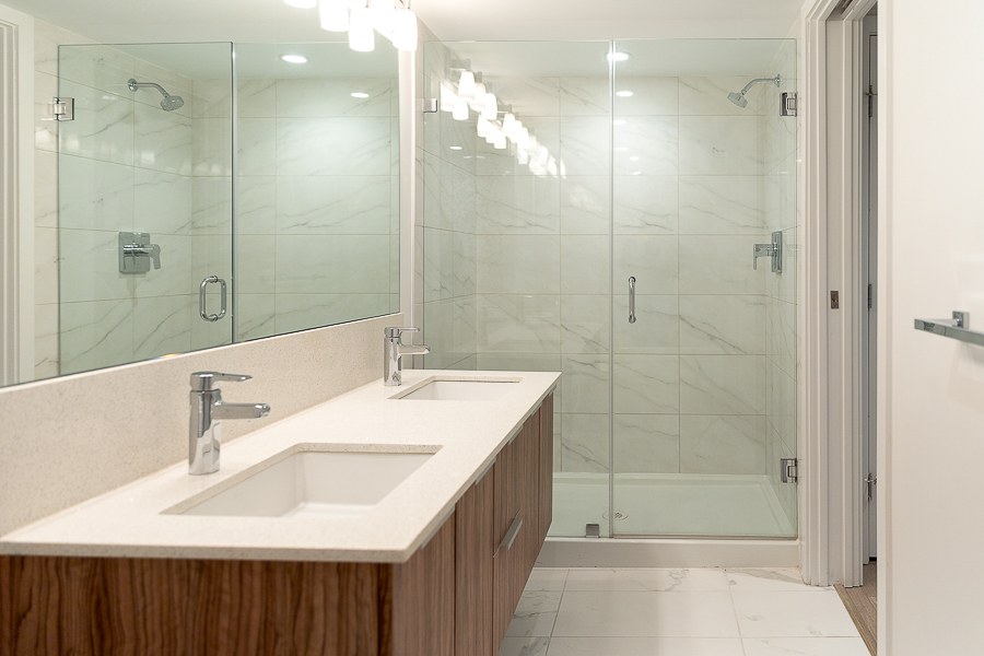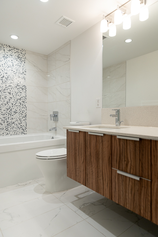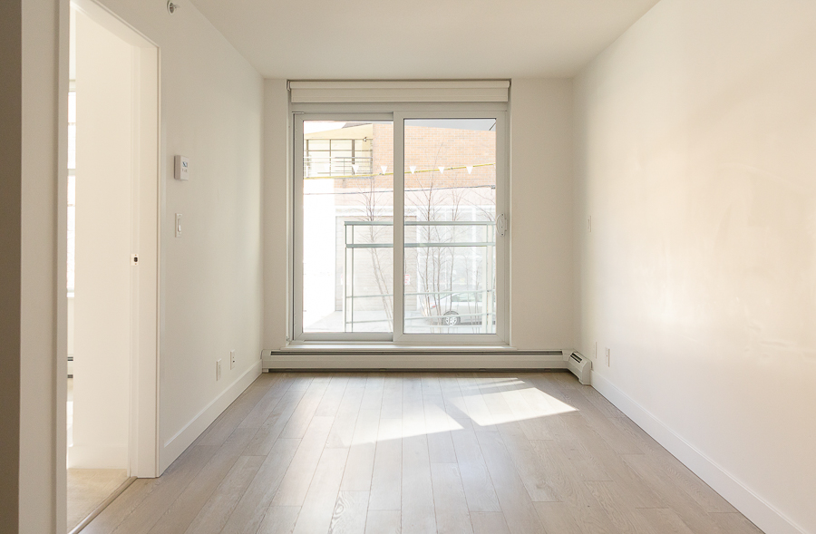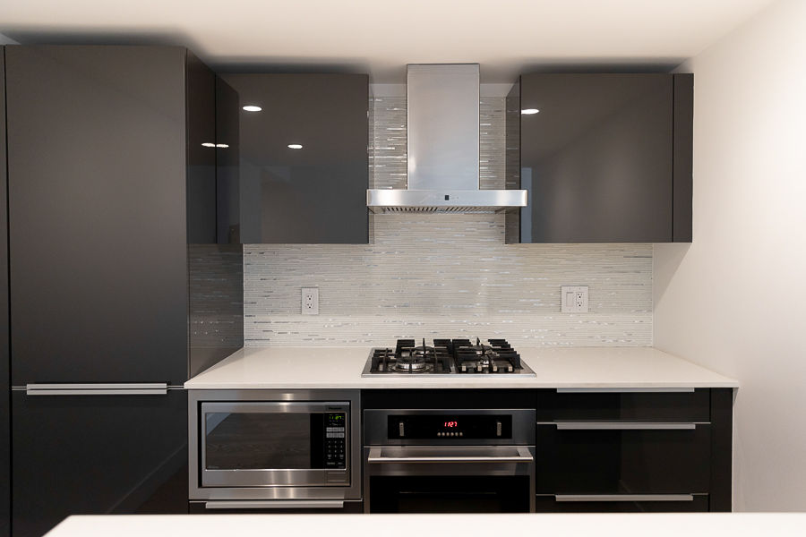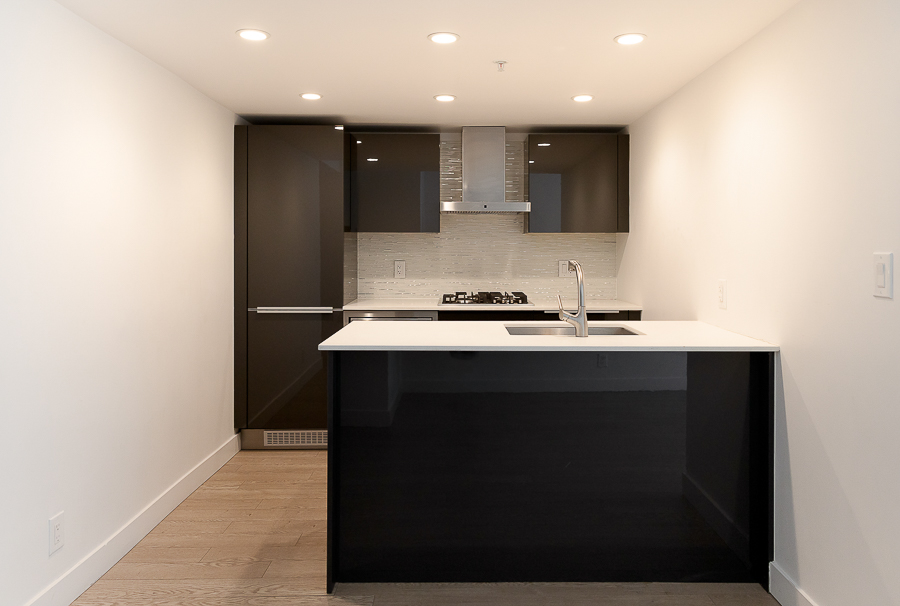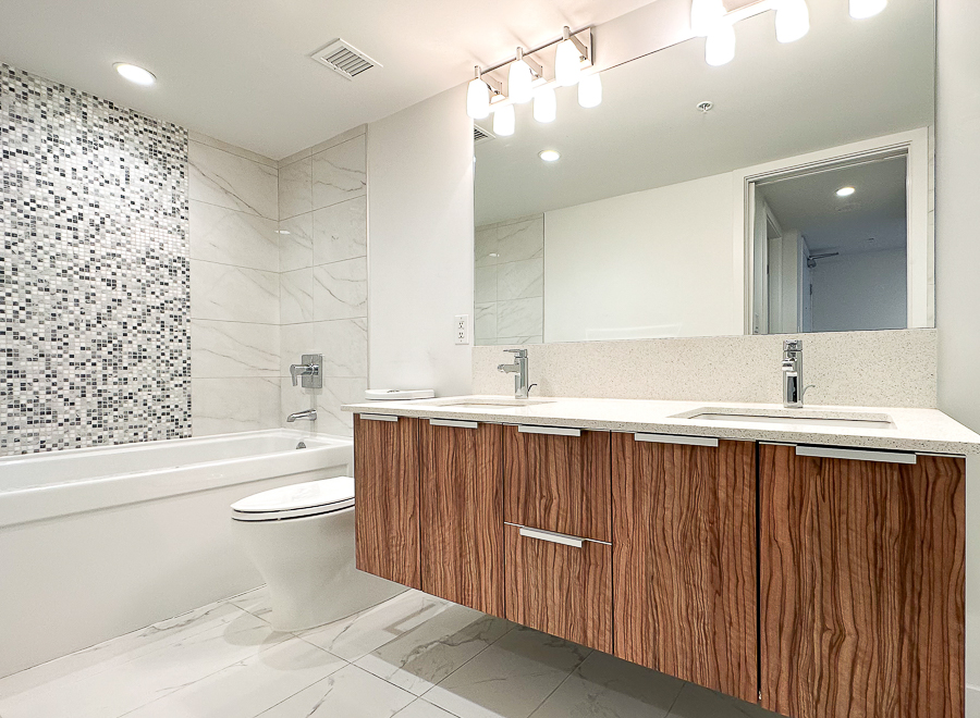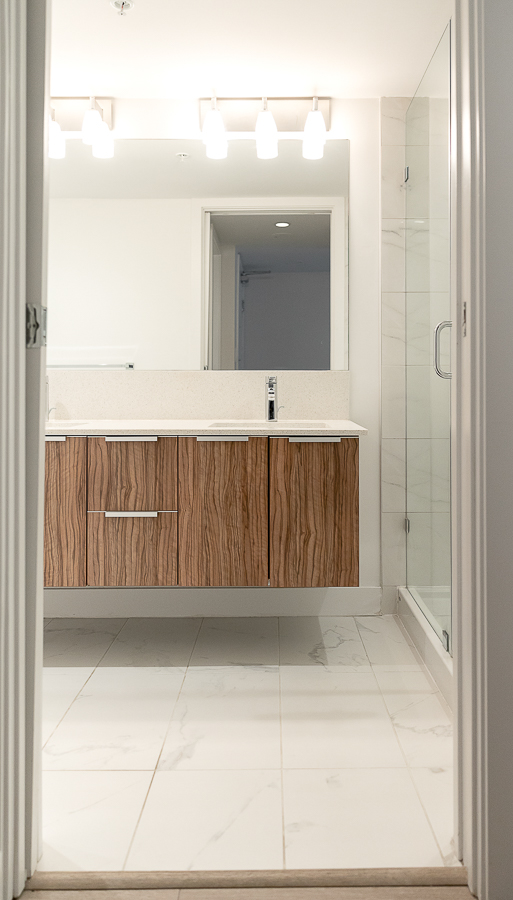 Features in this one bedroom unit include large windows and roller blinds, a 5-piece bathroom with double vanity and a walk-in shower and bathtub, laminate flooring throughout living areas and a carpeted bedroom, modern kitchen with European cabinetry and elegant with polished-edge quartz countertops and integrated stainless steel appliances, in-suite washer and dryer, large flex space, and a small balcony