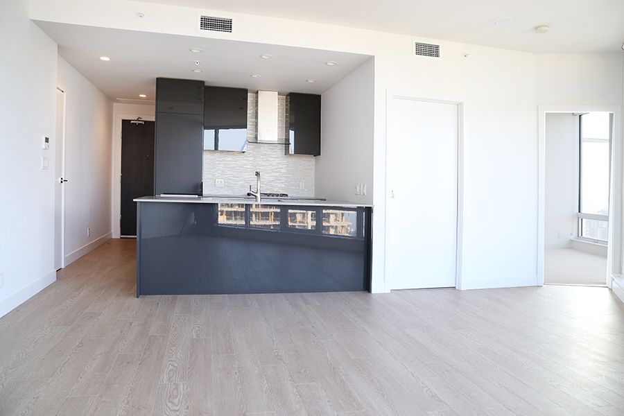 Features Include Two sunny bedrooms with large windows and roller blinds, two bathrooms with in-floor radiant heating, laminate flooring throughout the home, open plan kitchen with European cabinetry systems, elegant polished-edge quartz countertops, stainless steel fridge, stove/oven, dishwasher, and microwave, private balcony with expansive city views, in-suite washer and dryer, with extra storage space for linens, Large flex space, perfect as an office, storage room, or pantry