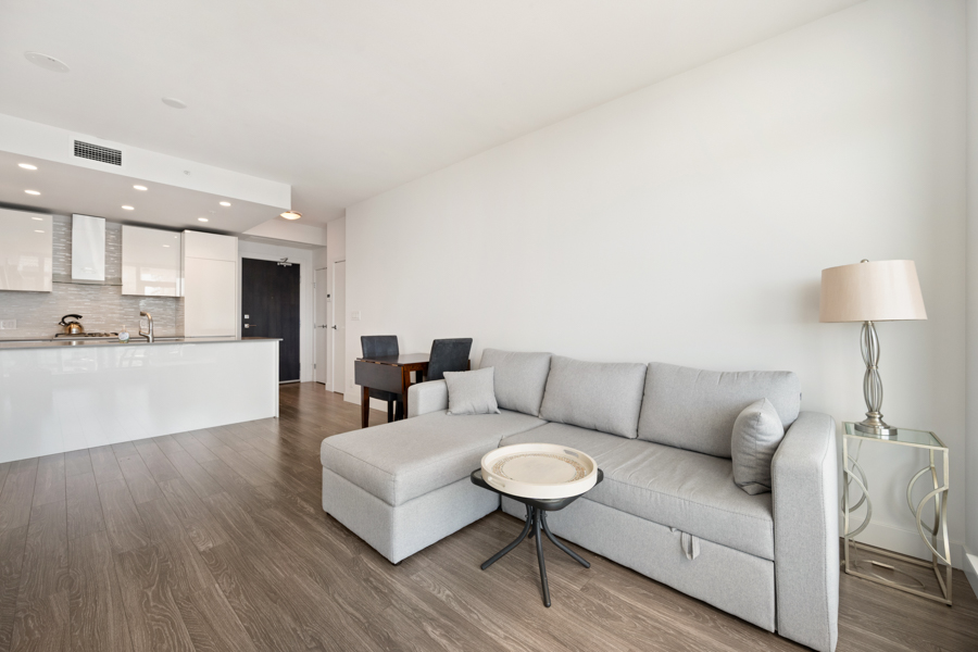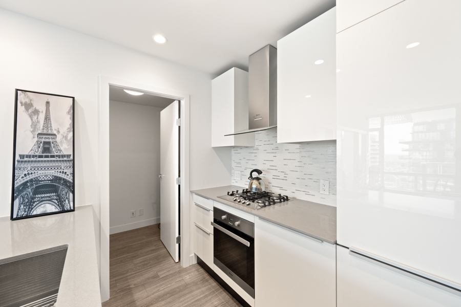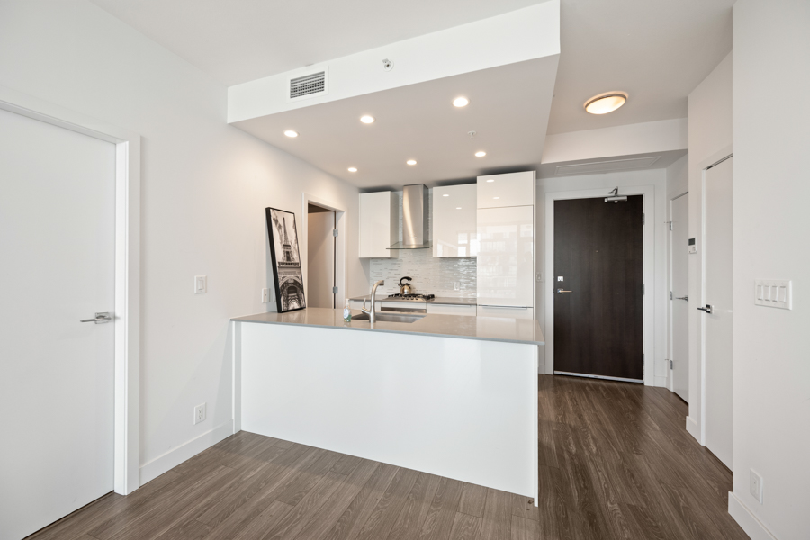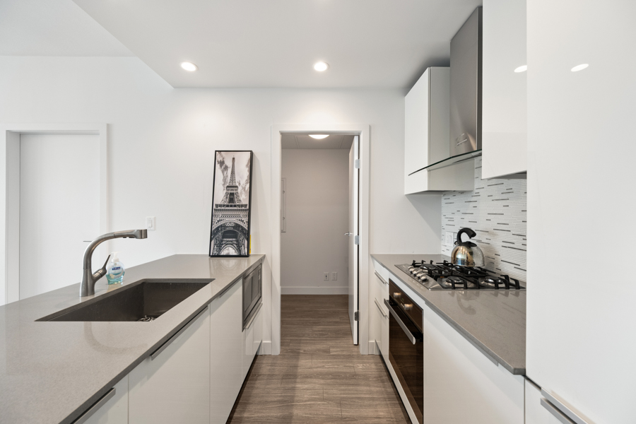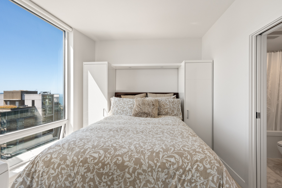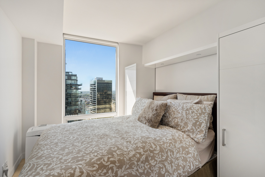 Features in this 39th floor unit include floor-to-ceiling windows, engineered laminate wood flooring, open plan kitchen with European cabinetry systems, elegant polished-edge quartz countertops & kitchen island peninsula, and stainless steel and integrated appliances: Fridge, Miele gas cook top, oven, dishwasher, and microwave. Flex space, perfect for an office or extra storage, private patio, and a portable A/C Unit. In-suite washer and dryer