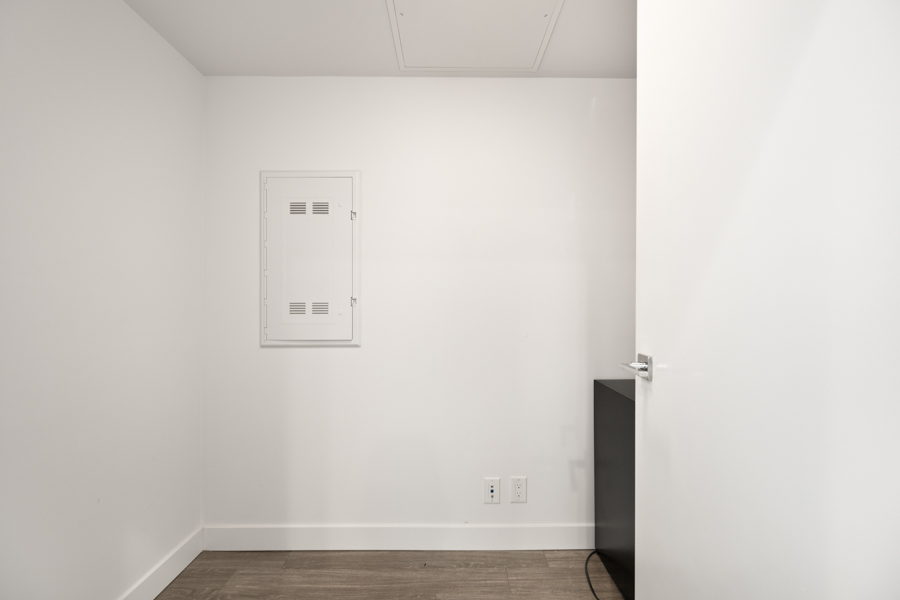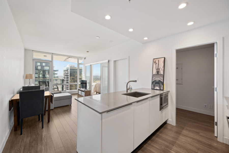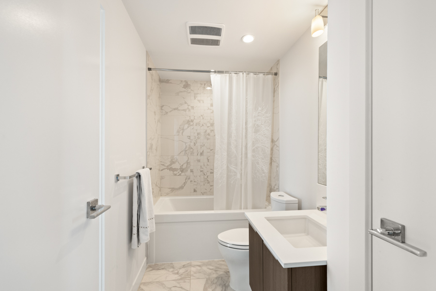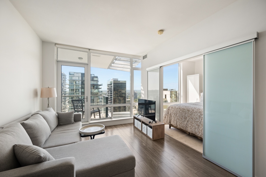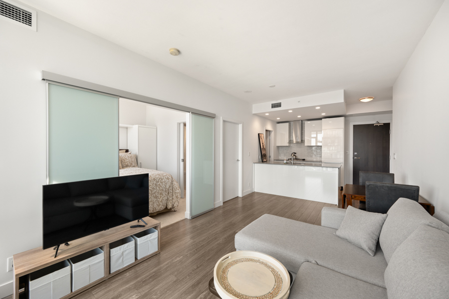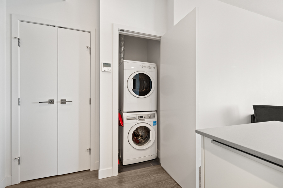 Features in this 39th floor unit include floor-to-ceiling windows, engineered laminate wood flooring, open plan kitchen with European cabinetry systems, elegant polished-edge quartz countertops & kitchen island peninsula, and stainless steel and integrated appliances: Fridge, Miele gas cook top, oven, dishwasher, and microwave. Flex space, perfect for an office or extra storage, private patio, and a portable A/C Unit. In-suite washer and dryer