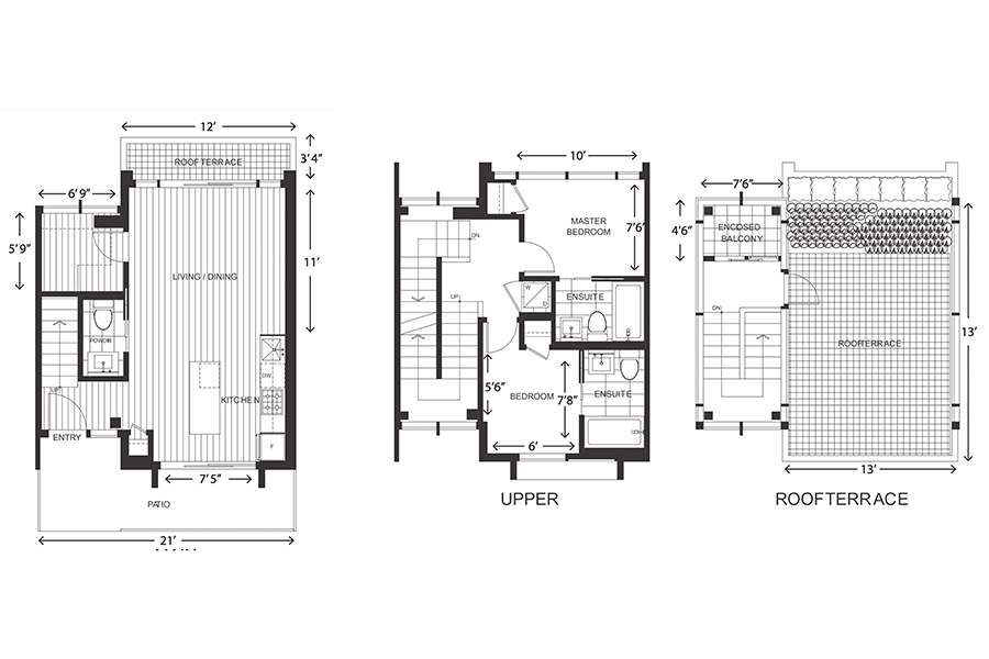 Features include two compact bedrooms, second bedroom includes murphy bed, two full ensuite bathrooms upstairs with a powder room downstairs, laminate flooring throughout the home, open plan kitchen with European cabinetry, elegant polished-edge quartz countertops, stainless steel fridge, stove/oven, dishwasher, and microwave, rooftop terrace with another balcony off of the living room, and in-suite washer and dryer.
