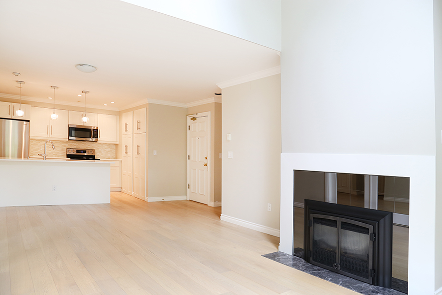 Features in this unit include 2 large bedrooms, each with abundant closet space, 2 full bathrooms, laminate wood flooring throughout the home, sizable dining area, sunny and spacious living room with gas fireplace and stunning vaulted ceilings, renovated, open plan kitchen with ample storage space and modern fixtures, fridge, stove, oven, dishwasher, and microwave, in-suite washer and dryer, and private balcony with water views.