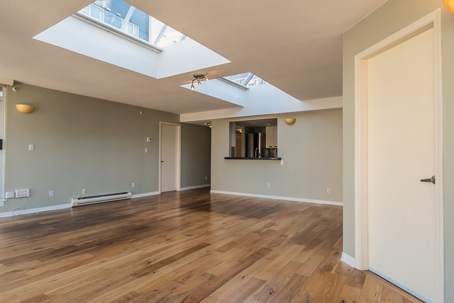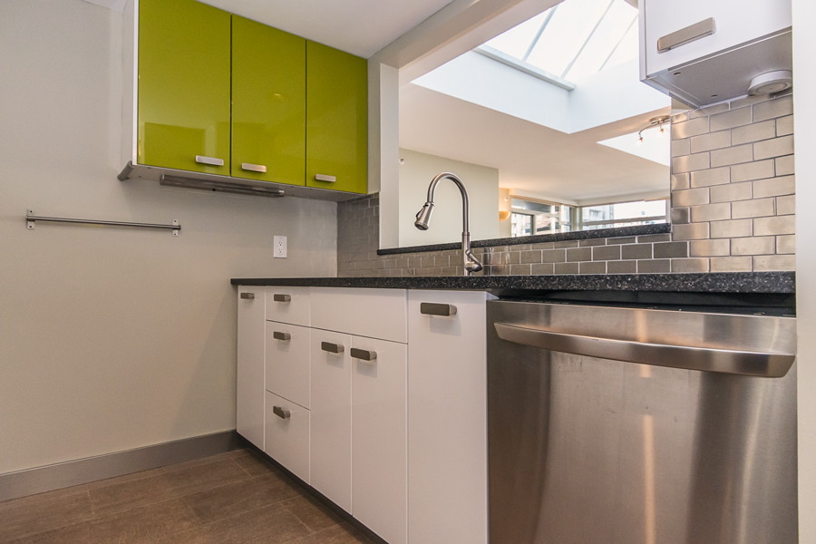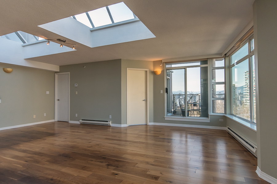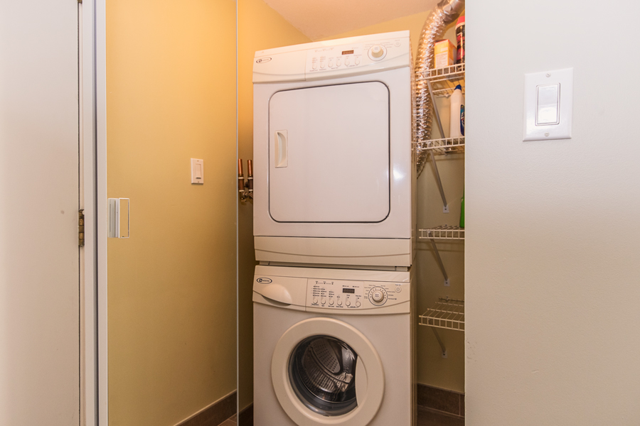 Features in this penthouse unit include 3 large balconies with water, mountain, and city views, 2 large skylights with remote control blinds, modern Kitchen with quartz countertops, full-size Stainless-steel appliances, bedrooms on separate sides of unit, upgraded bathrooms, ample storage throughout, in-suite washer and dryer, and 2 side by side parking stalls