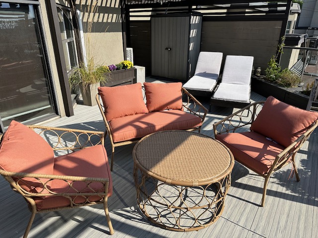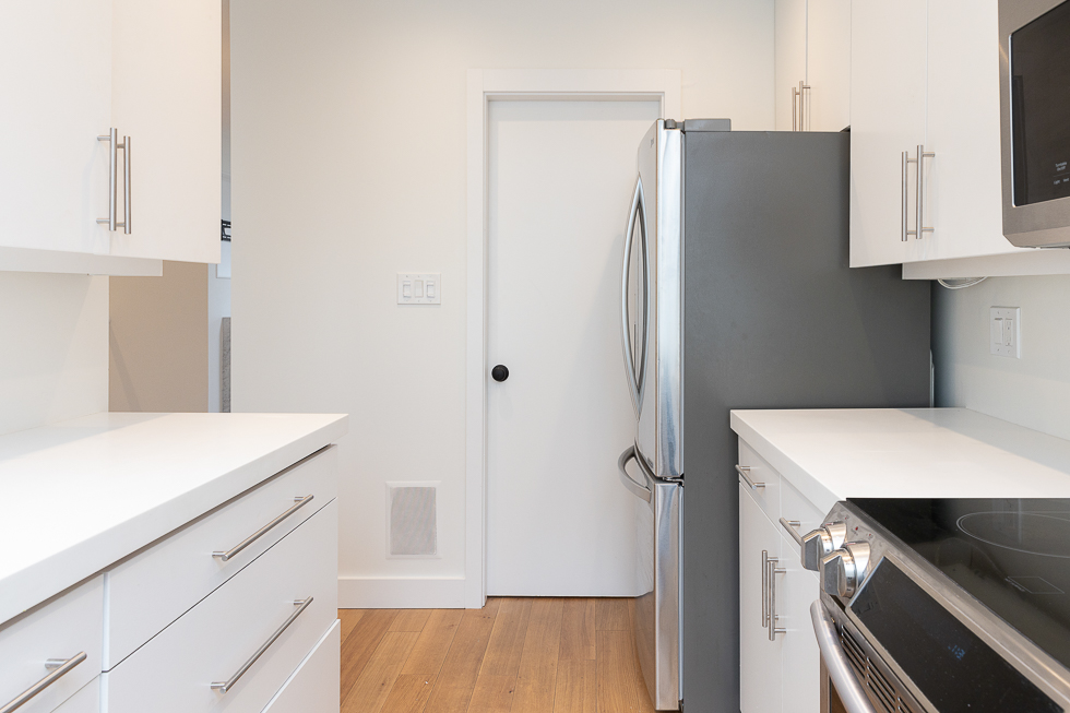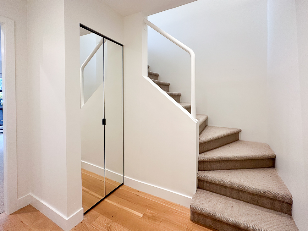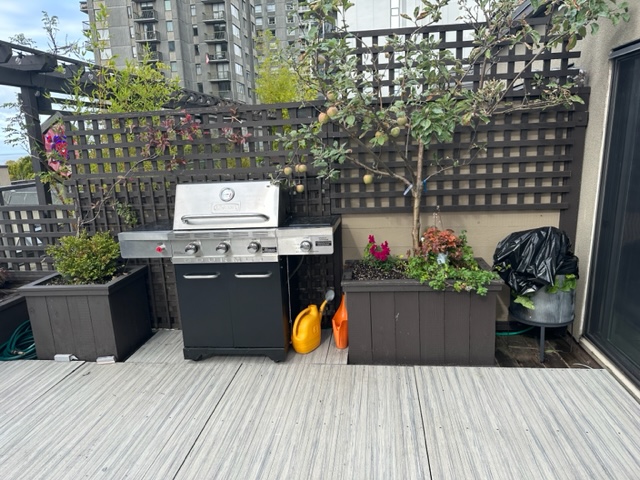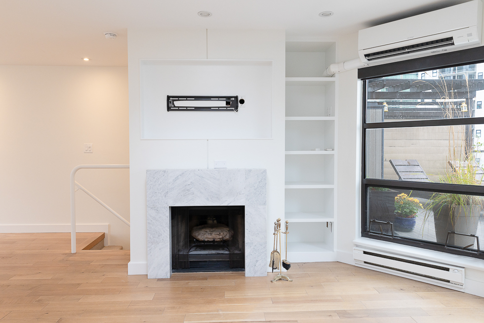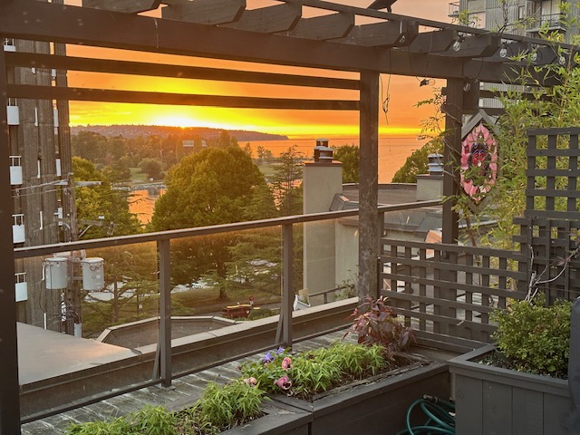 with a powder room, large entertainment patio with stunning sunset views of English Bay (patio furniture and BBQ included) and ~80 sqft of maintained permanent planter boxes, skylights in kitchen & living area, wood-burning fireplace and built-in cabinet in living room, a modern bright kitchen with lots of counterspace & cupboards & full-size Stainless-steel appliances, a primary bedroom that fits king-sized bed with room to spare & its own balcony, brand new pure New Zealand wool carpeting, full-ensuite bathroom, and 3 closets, this unit also has an in-suite washer and dryer