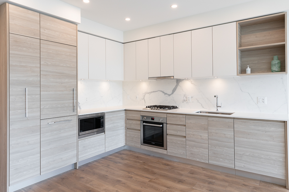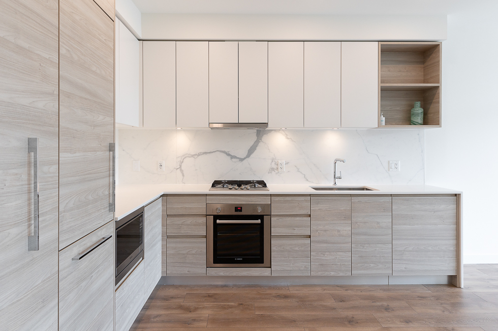 Features in this 10th floor unit include balcony with views of neighbourhood, Air Conditioning, modern Kitchen with quartz counter tops, lots of storage, and integrated & stainless steel Bosch appliances, large den with sliding frosted doors, engineered wood flooring throughout, and in-suite washer and dryer
