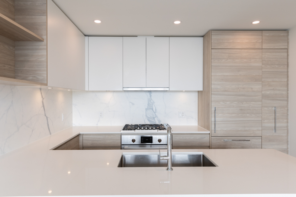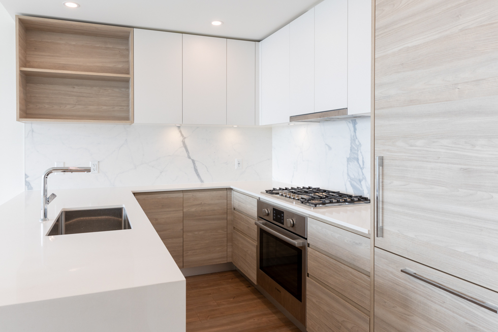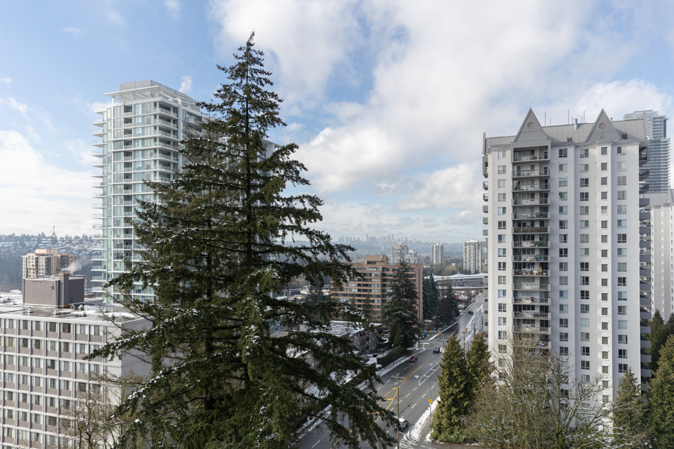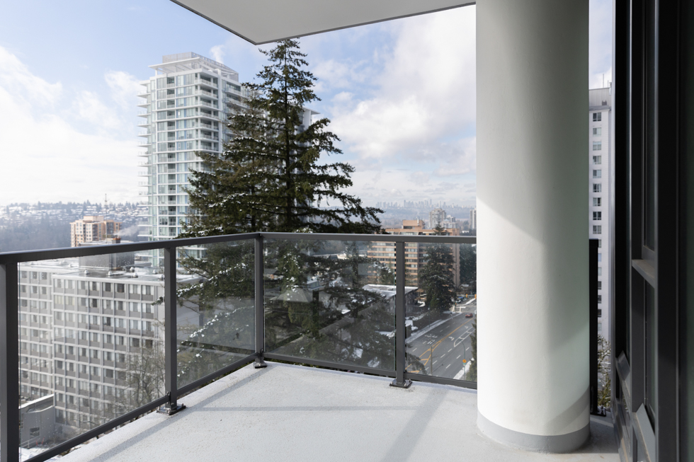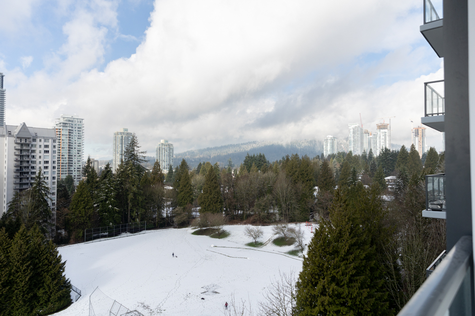 Features in this 10th floor unit include covered patio with views of green space and mountains, a functional floor plan with a modern open kitchen with quartz counter tops, lots of storage, and integrated & stainless-steel Bosch appliances: fridge, primary bedroom with ensuite, Air Conditioning, engineered wood flooring throughout, and in-suite side-by-side washer and dryer