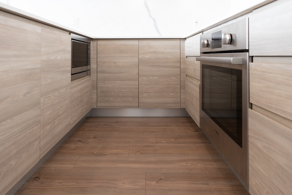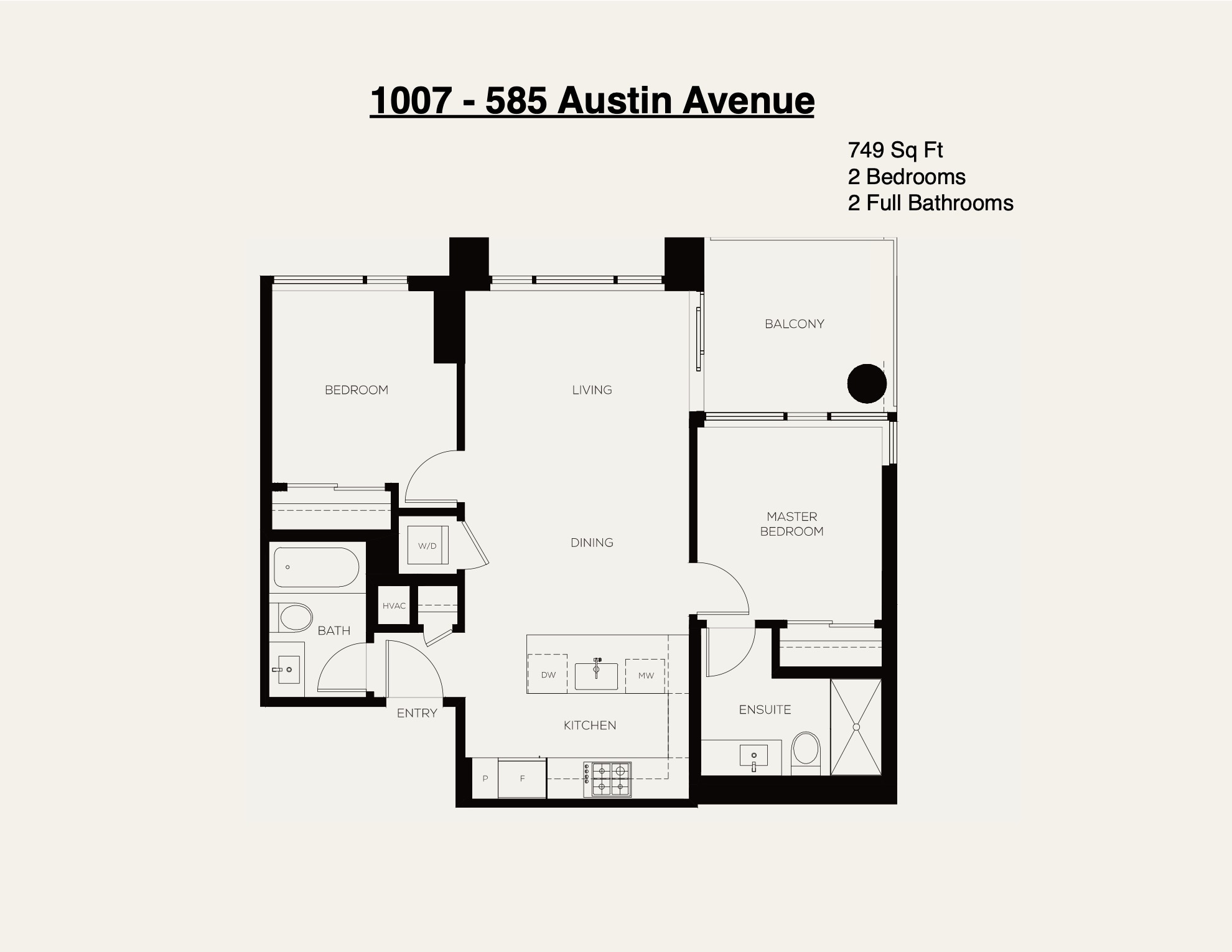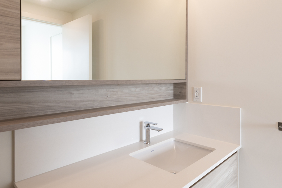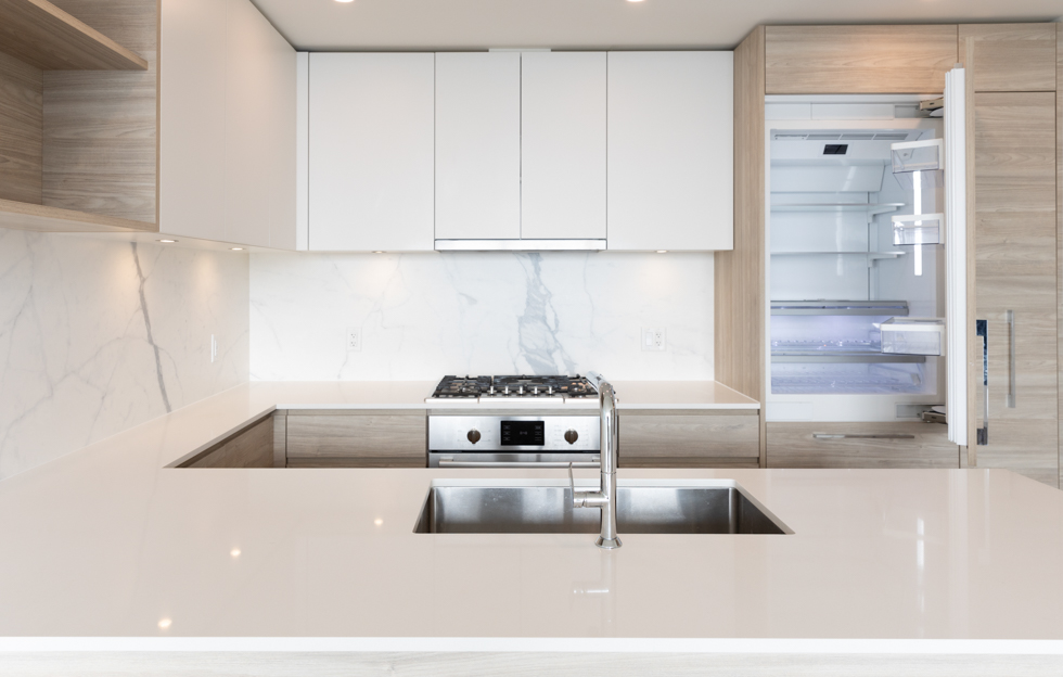 Features in this 10th floor unit include covered patio with views of green space and mountains, a functional floor plan with a modern open kitchen with quartz counter tops, lots of storage, and integrated & stainless-steel Bosch appliances: fridge, primary bedroom with ensuite, Air Conditioning, engineered wood flooring throughout, and in-suite side-by-side washer and dryer