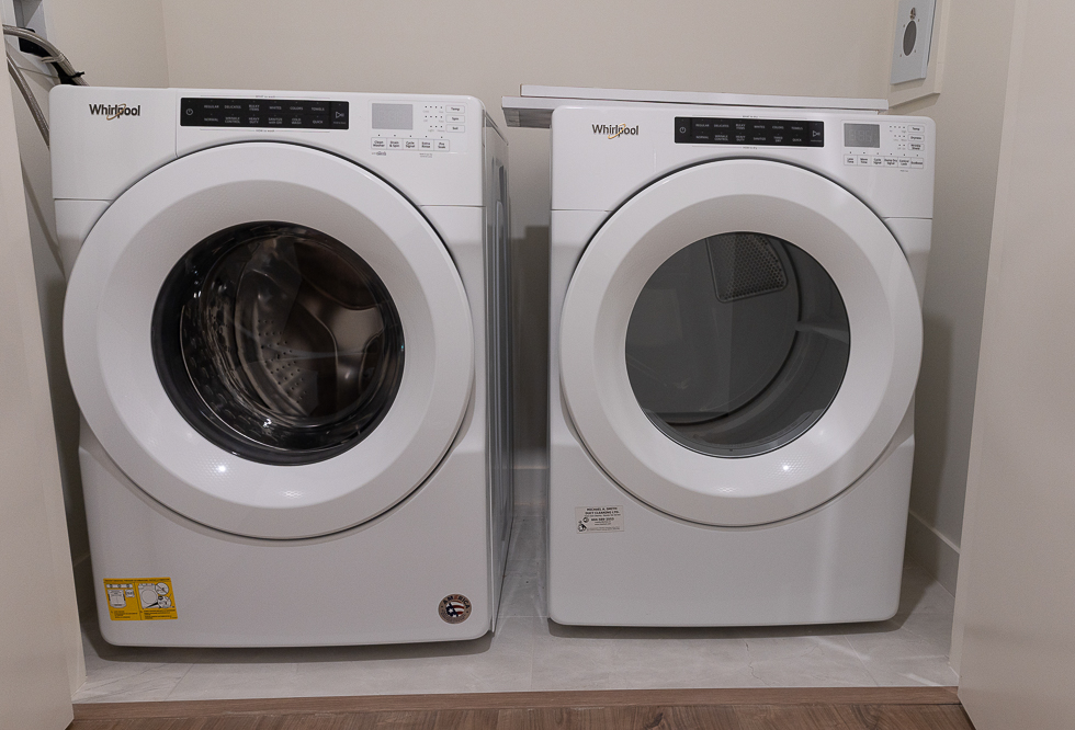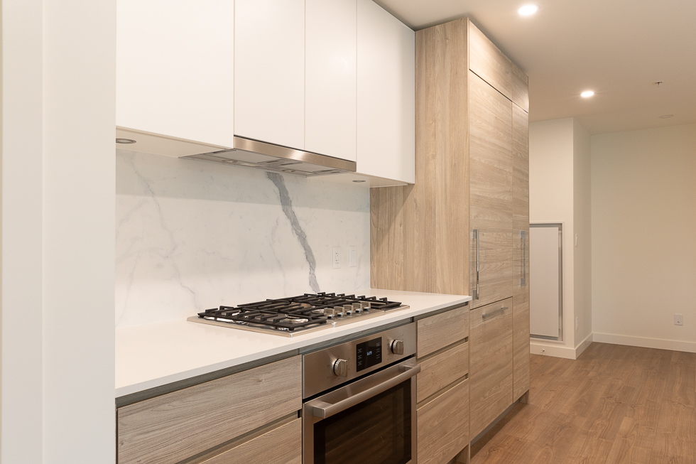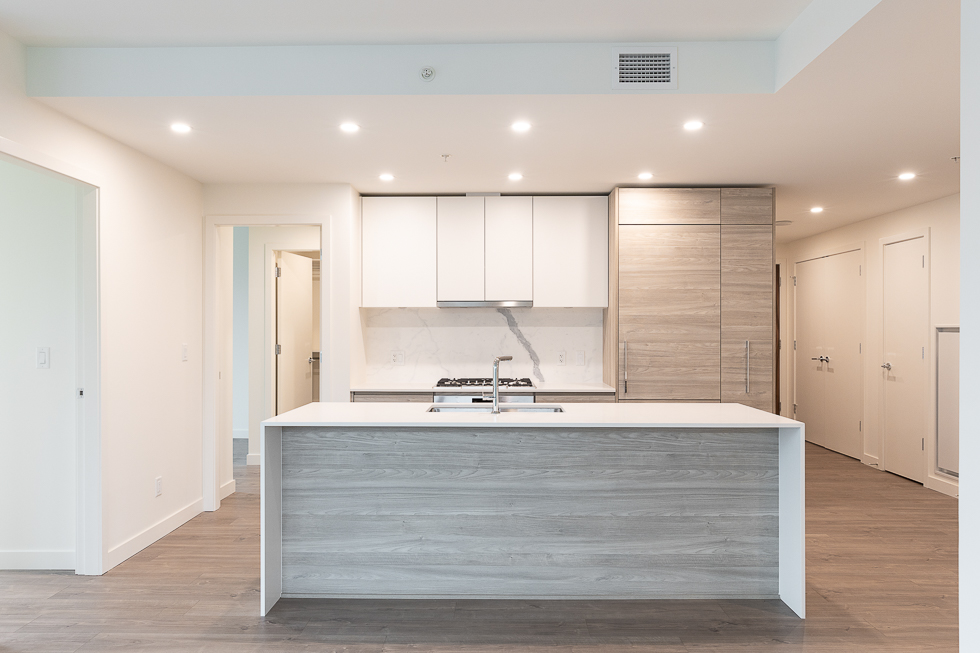 Features in this 8th floor unit include covered 168 sq ft balcony with views of nearby green space and putting green, a functional floor plan with open flex space off of the kitchen, a modern Kitchen with quartz counter tops, lots of storage, and integrated & stainless-steel Bosch appliances: fridge, primary bedroom with ensuite, Air Conditioning, engineered wood flooring throughout, and in-suite side-by-side washer and dryer